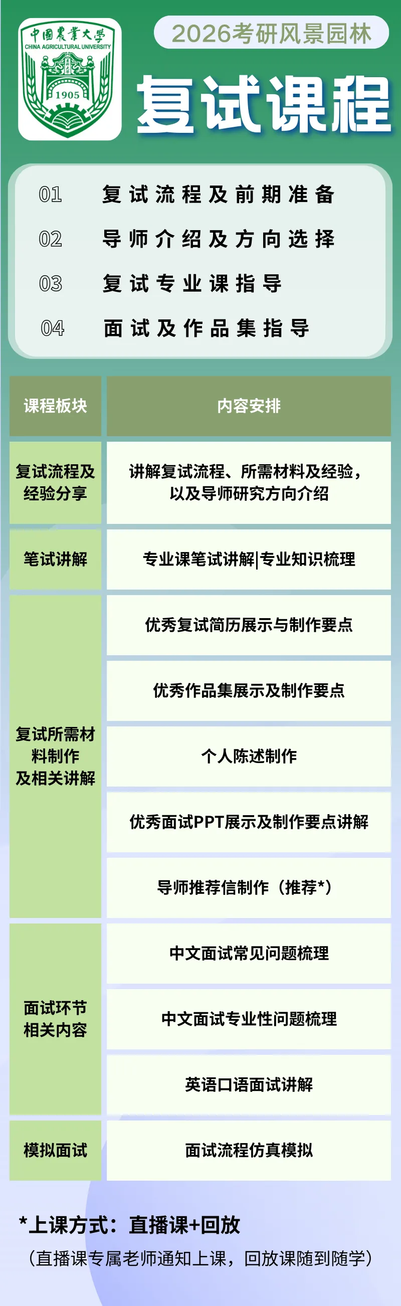 风景园林:专业重点考核考生的思想政治素质和品德、专业基础、实践能力和职业素养。复试内容主要包括思想政治素质和品德考核、专业技能综合笔试、综合面试(含外语能力、专业基础与综合能力)。