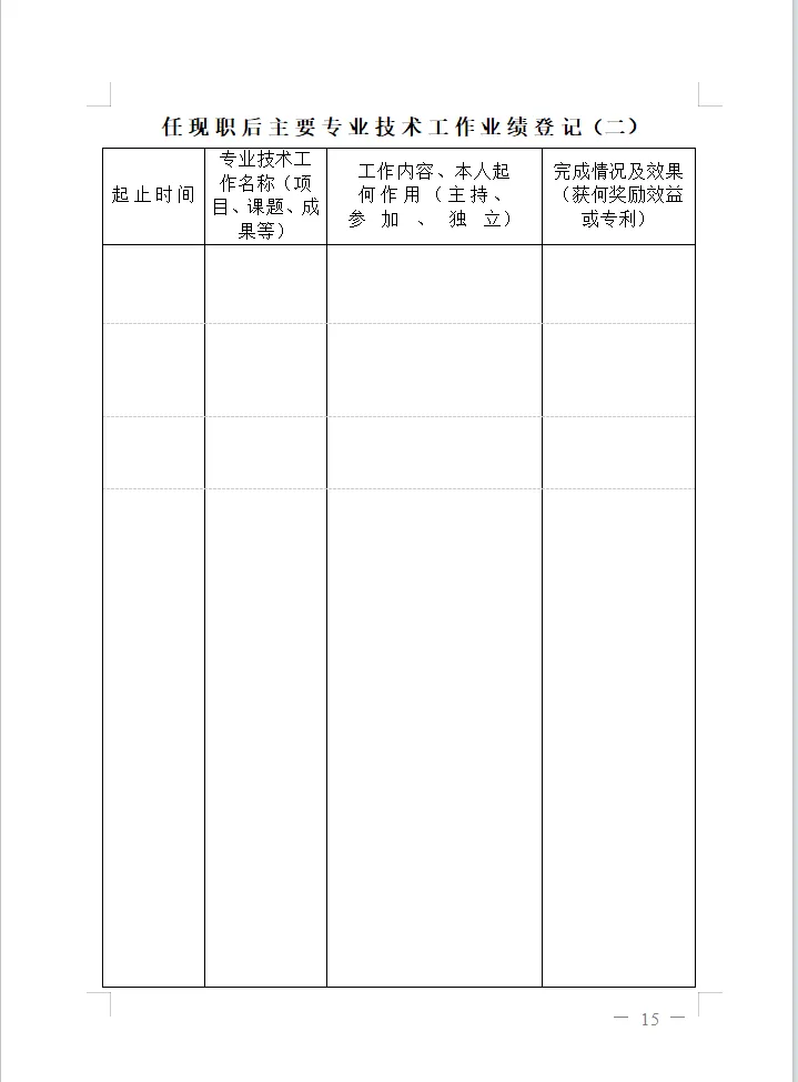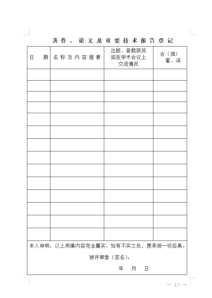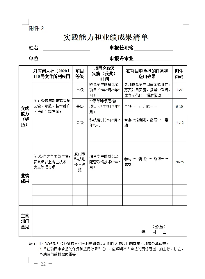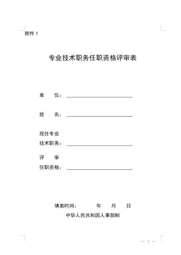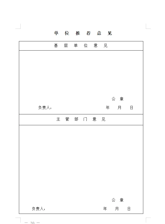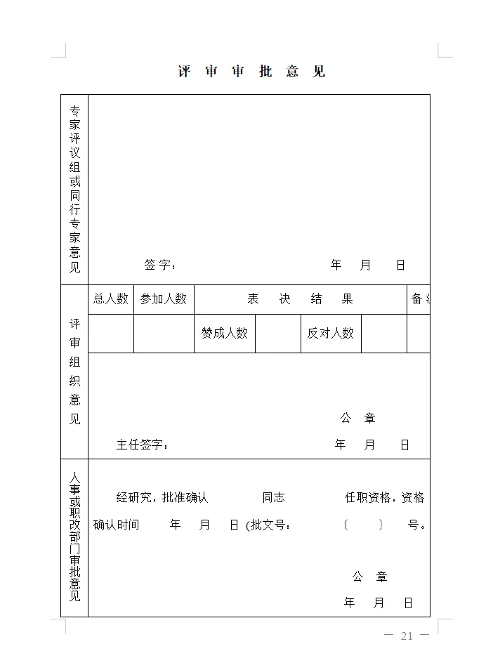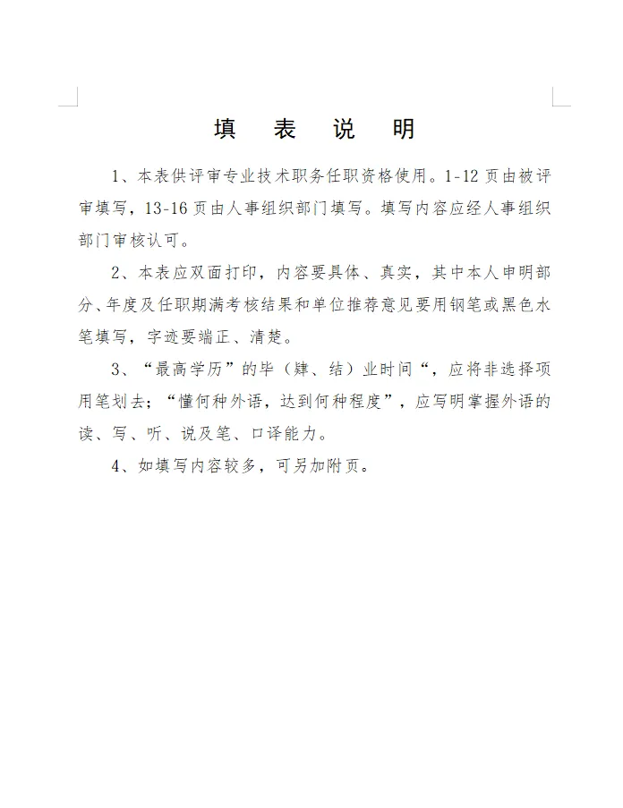 (一)《专业技术职务任职资格评审表》(简称《评审表》),一式2份。《评审表》应填入申报人员的实践能力(经历)和业绩成果内容;“年度及任职期满考核结果”栏,考核单位对申报对象作出客观评价的同时应明确任期内每一年度的考核结果;“基层单位意见”栏,应有简单评价并明确“情况属实、同意推荐”。《评审表》应双面打印并如实填写,其中本人申明部分、年度及任职期满考核结果和单位推荐意见要用黑色水笔填写。评审表主管意见栏目需要盖上主管部门和人社部门的印章。