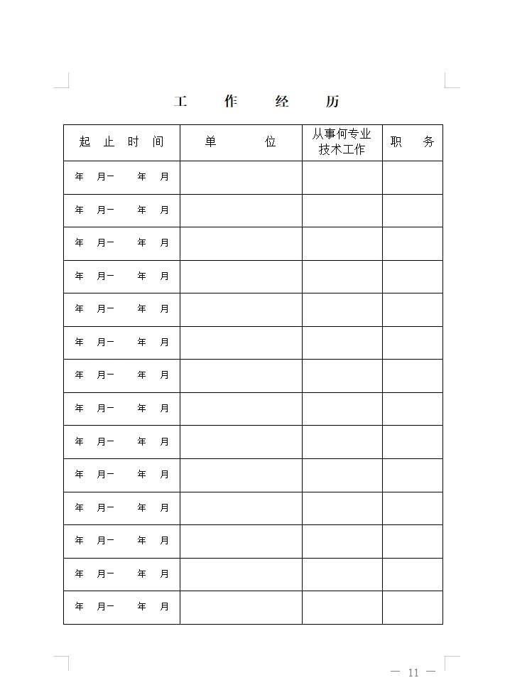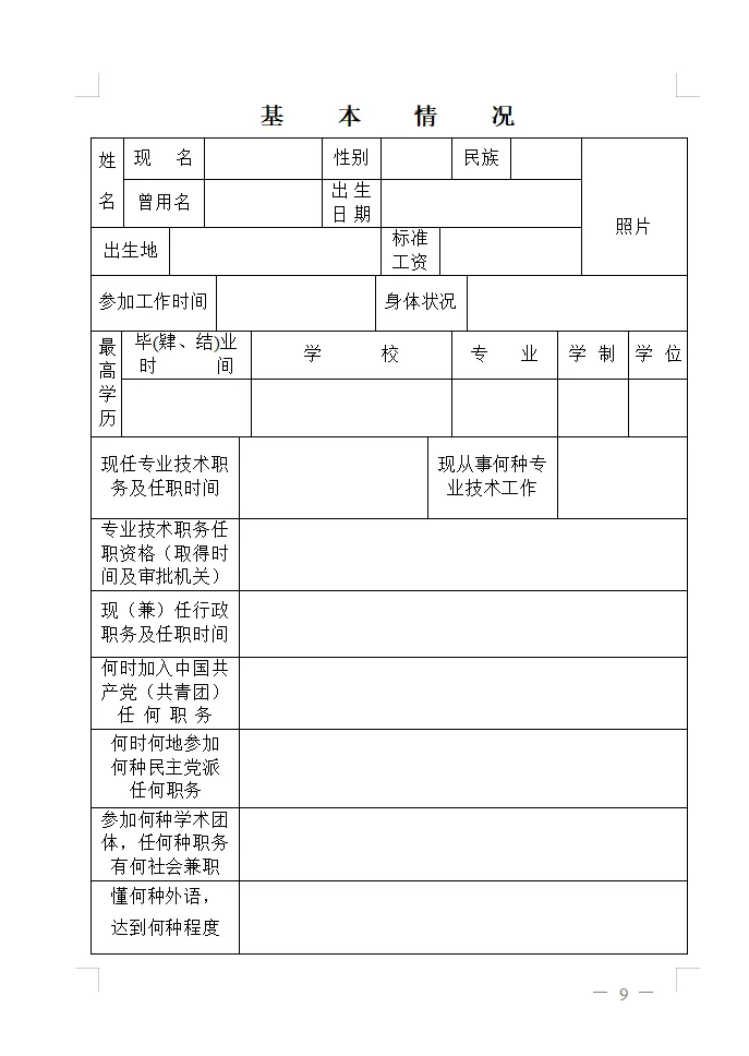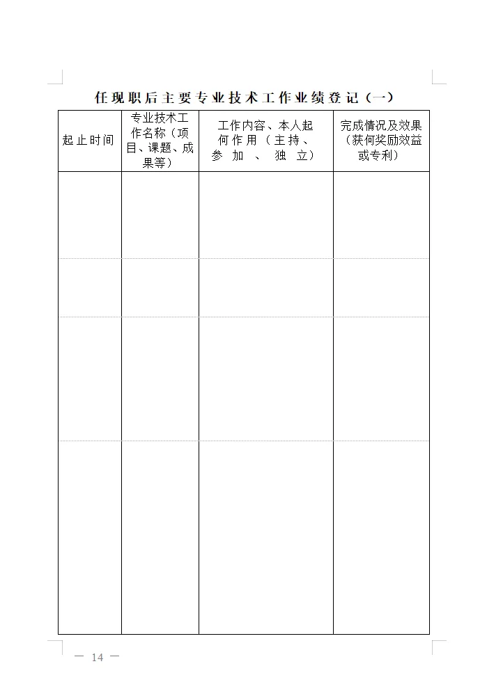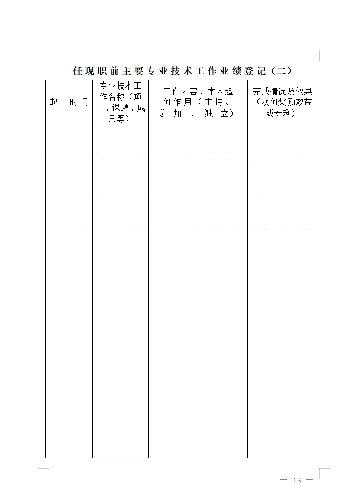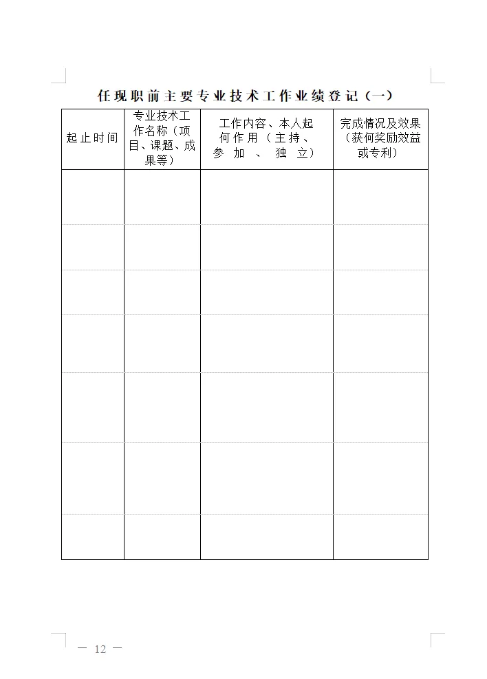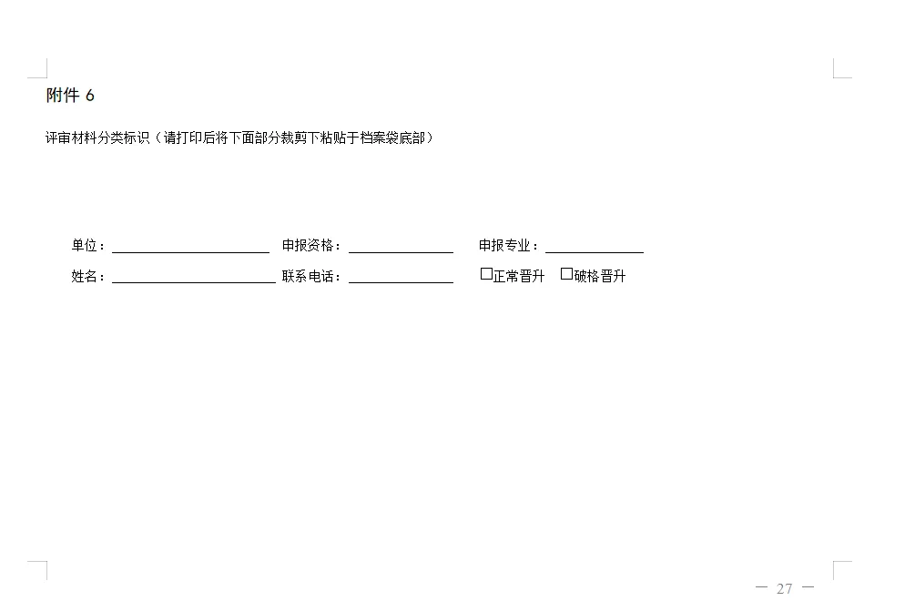 (一)《专业技术职务任职资格评审表》(简称《评审表》),一式2份。《评审表》应填入申报人员的实践能力(经历)和业绩成果内容;“年度及任职期满考核结果”栏,考核单位对申报对象作出客观评价的同时应明确任期内每一年度的考核结果;“基层单位意见”栏,应有简单评价并明确“情况属实、同意推荐”。《评审表》应双面打印并如实填写,其中本人申明部分、年度及任职期满考核结果和单位推荐意见要用黑色水笔填写。评审表主管意见栏目需要盖上主管部门和人社部门的印章。