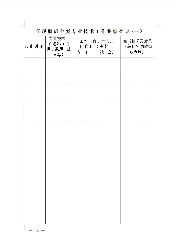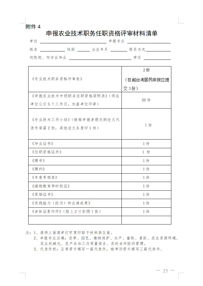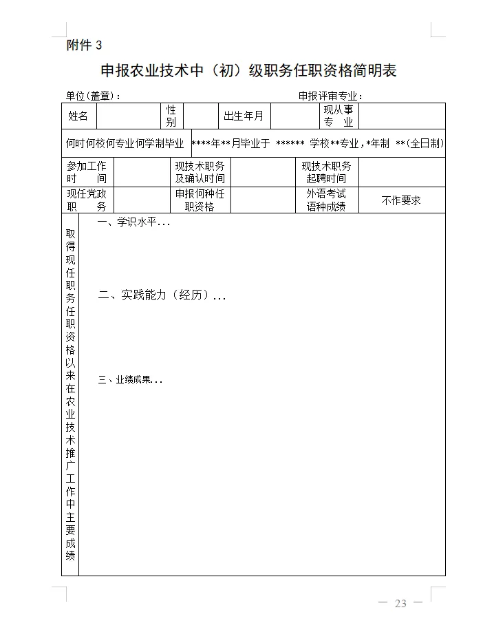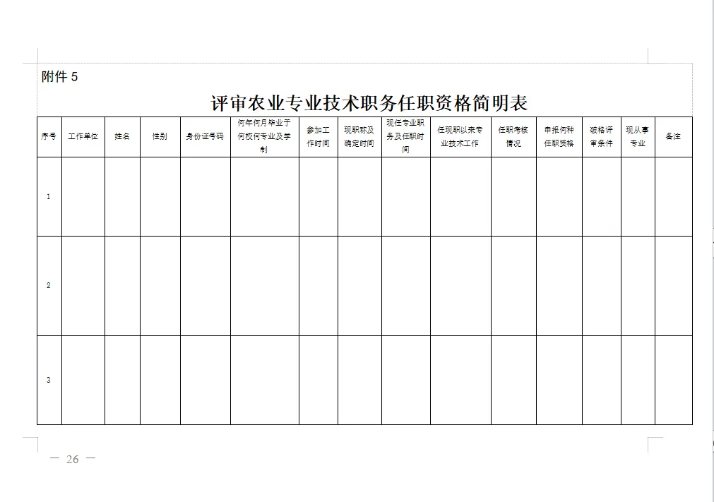 (二)《申报农业技术中级职务简明表》20份。其工作业绩(含论文)必须是取得现任职务任职资格以来的。该表应采用A4纸双面打印,字迹清晰,字体要求使用仿宋体,字号、行距不得小于小四号字,单倍行距,不要另加附页,表格应公示并加盖申报人员所在单位印章。