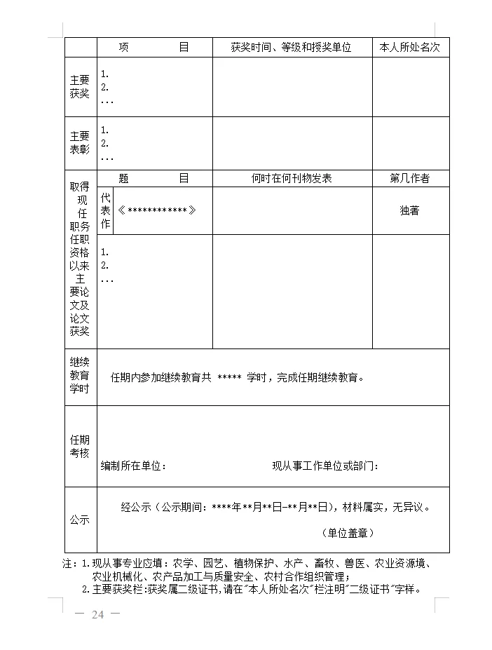 1.为保证申报材料的真实性,《评审表》中的“任现职后主要专业技术工作业绩登记”及《申报农业技术中级职务简明表》应在本单位进行公示,公示期限不少于5个工作日。申报材料均须由单位加盖审核印章。