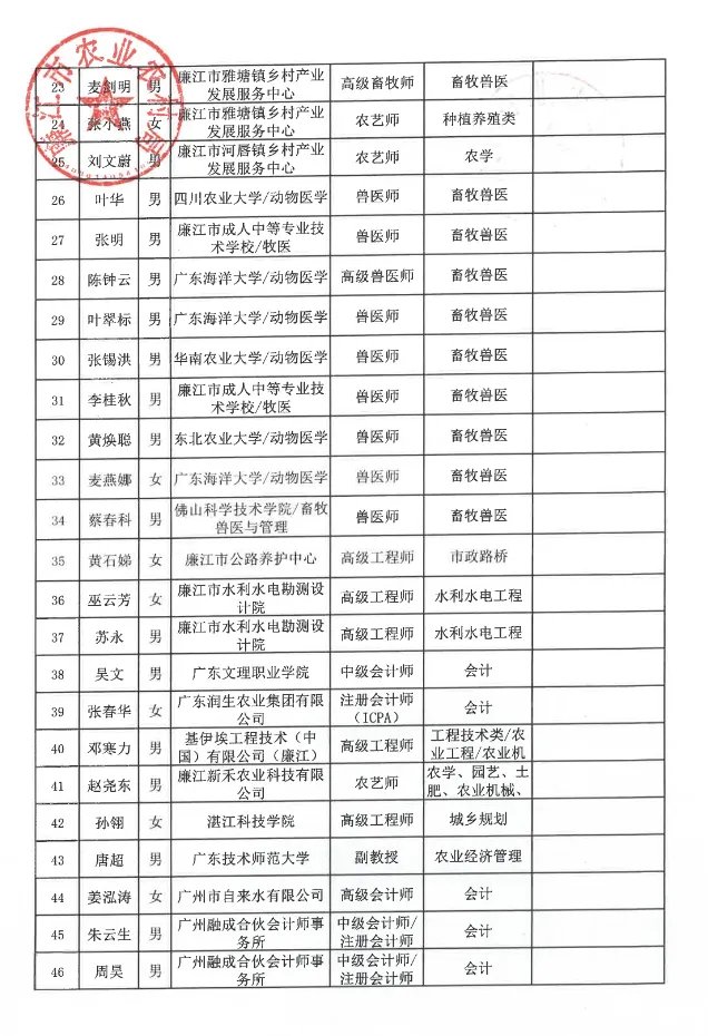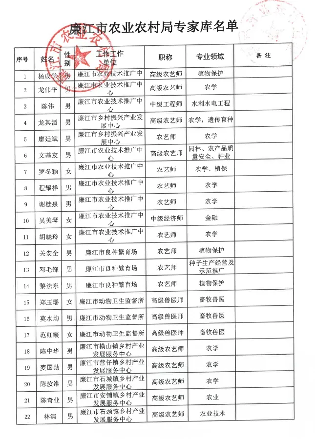 根据《关于调整完善廉江市农业农村局专家库专家成员的公告》,我局面向社会公开征集农业农村领域专家。经个人申请、单位推荐及局班子会议审议等程序,拟确定杨成学等57人为我局专家库专家(详见附件),现将名单予以公布(排名不分先后)。