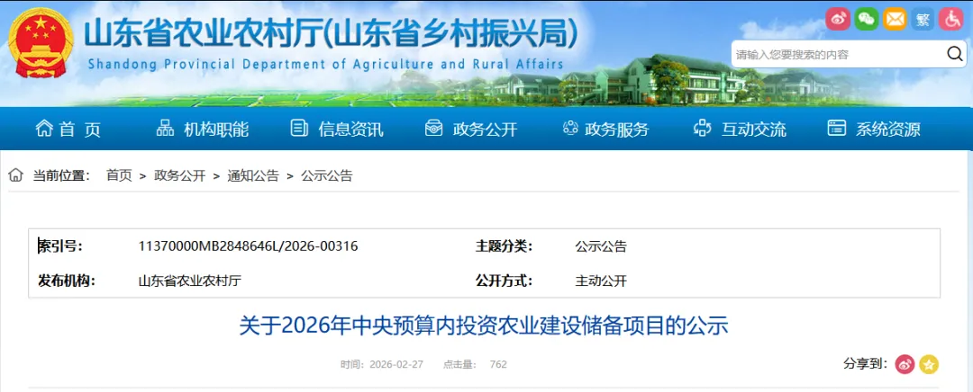 根据《农业农村部中央预算内直接投资农业建设项目管理办法》《农业农村部中央预算内投资补助农业建设项目管理办法》,我厅联合省发展和改革委员会组织专家对有关市申报的2026年中央预算内投资农业建设项目的实施方案、可行性研究报告、初步设计及概算完成了评估审核,现予以公示。公示时间:2026年2月27日-3月4日(5个工作日),如有异议请在公示期间及时反馈相关情况,电话:0531-51789176。
