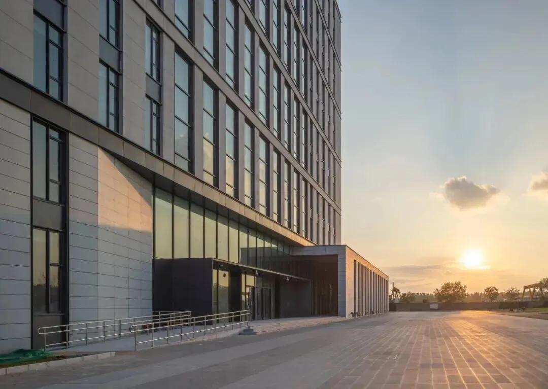 建筑外立面采用现代、简洁、理性的设计手法,外窗分格变化取自基因图谱的抽象表达,建筑局部外立面装饰采用穿孔金属板,图案取自麦穗意向。