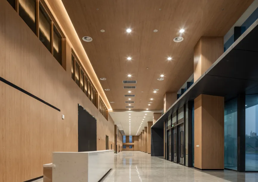 建筑的首层,门厅、咖啡厅前区、多功能厅前厅以及报告厅前厅相互连通,构成了连续而完整的共享空间,可灵活用于室内大型集散、学术会展与交流活动。二层会议室前区与挑高中庭相结合,形成开放通透的交流节点;标准实验层每层均设有共享交流区;实验室采用落地玻璃隔墙,增强视觉连通性。这些空间设计策略旨在打破不同类型使用者及不同课题研究组之间的交流壁垒,促进人际互动与知识共享。