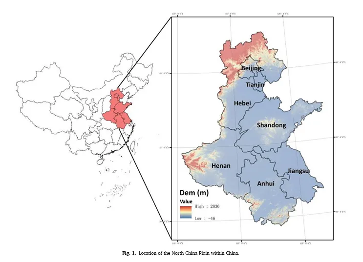 华北平原(黄淮海平原)由5个省(山东、河南、河北、江苏、安徽)和2个城市(北京、天津)组成(图1)。全区共有317个县市,总人口超过2.5亿,其中67.79%以农业为生。平原为冲积型,地势低洼,海拔一般在50米以下。NCP总面积约为350 ×105公顷,是中国第二大平原。平原耕地面积超过230,105公顷,约占中国耕地面积的20%。平原农业实行夏玉米-冬小麦轮作制,生产我国夏玉米30%以上,冬小麦产量占70%以上;因此,NCP是中国主要的粮食产区。然而,一些地区降水不足,因为年平均潜在蒸散量超过1000毫米。地下水遭到破坏,导致旱涝灾害频发。NCP已成为中国最干旱的地区之一,面临严重的水资源短缺。此外,土地退化也逐渐变得更加严重。