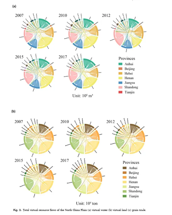 NCP是中国主要的粮食产区,但相对于其高产而言,面临着很高的缺水压力。在这项研究中,我们重点关注NCP中的粮食作物(水稻、小麦和玉米)。我们应用Penman-Monteith方程来模拟作物的需水量,并使用2007-2017年期间的环境扩展多区域投入产出模型确定了与谷物贸易相关的虚拟土地和虚拟水的流动。本研究评估了土地-水-食物关系的耦合协调性,揭示了区域农业生产中资源配置的合理性。该研究的主要发现如下: