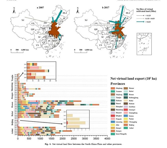与粮食贸易相关的虚拟水(图2 a)和虚拟土地(图2 b)在NCP生产端与其他省份消费端之间的流动关系如图2所示。全国大会党的各省在资源需求方面主要表现出自给自足。除北京和天津外,全国大党各省的虚拟资源提供了当地50%以上的需求。北京和天津消耗的虚拟资源相对较少,占NCP总量的1%,其需求主要由外省进口来满足。河南是NCP最大的资源提供者,在研究的十年中,向NCP的其他六个省份和中国其他六个地区出口了大量虚拟资源。2007—2017年,河南省虚拟土地总产量增加,均值为8610.24×103电子烟在这段时间里,河南的虚拟水总产量接近300×108m3,跌至182.90×108m3,并增加到372.76×108m3,表明整体呈上升趋势。河南粮食贸易总产量由4184.40×10增加4ton 在2007年达到5937.27×104吨在这一年里 2017.2007—2017年河北省虚拟土地生产量波动明显,但对其他省份的虚拟土地供应量没有明显变化。例如,在 2010 年,产量为 4837.32 × 103ha,1825.81 × 103为河北本地需求分配。2017年产量达到5439.46×103公顷,其中 2903.60 × 103HA是根据当地需求分配的。因此,河北省的总产量似乎与当地虚拟土地需求的增加同时增加并行。河北省虚拟水总产量稳步增长,从172.26×10增长8到 205.93 × 108m3.粮食贸易总产量也有所增加,从2241.45×104至 3258.68 × 104吨。河北省虚拟资源生产主要面向中部地区(北京、天津、山东),并有向西南地区扩张的趋势。安徽提供的虚拟资源主要向东海岸和西北方向流动,并呈现向西南扩张的趋势。从2007年到2017年,安徽虚拟土地产量上升,从4314.79×10增加3至 6012.60 × 103电子烟安徽粮食贸易产量从2235.33×10增加4至 3561.84 × 104吨。虚拟水的产量增长缓慢,从208.96上升到10×8至 237.80 × 108m3。江苏的虚拟资源生产主要面向东部沿海、西南和安徽等地区。江苏对虚拟资源的需求并不大,江苏研究的3个虚拟资源自给率超过65%。2012年以前,江苏虚拟土地产量增长,然后趋于稳定,均值超过4000×103电子烟虚拟水的供应量增加到 193.08 × 108m3在研究的十年中。2012年以前粮食贸易供应量上升,2012年之后稳定,平均值为2800×103电子烟山东的资源自给率高于江苏,平均为75%,这意味着与江苏相比,山东拥有更高的资源生产,但对其他省份的供应较少。2007年至2017年,从国家协调中心流向其他地区的虚拟资源总量呈明显上升趋势。NCP生产的农作物主要满足当地需求,农业虚拟资源自给率随时间推移而增加,降低了跨区域供给的比例。