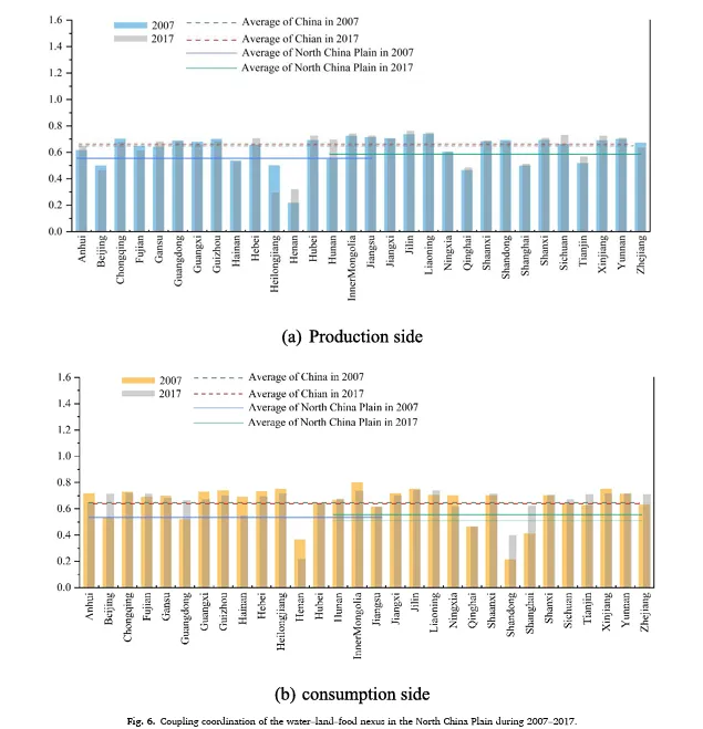 NCP中土地-水-食物关系的耦合协调在生产和消费方面都远低于全国平均水平。研究建议,应因地制宜地采用更合理的粮食种植模式,发展节水型耕作模式和生产技术,减少耗水作物出口,提高水资源利用率,缓解农业生产资源冲突。