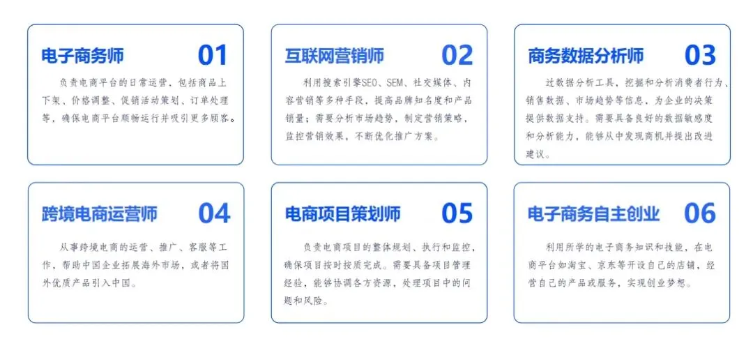 可在国内外电子商务平台从事商品运营、网络推广、数据分析、项目规划等工作,也可依托电商平台开展自主创业,就业面广、发展空间大。