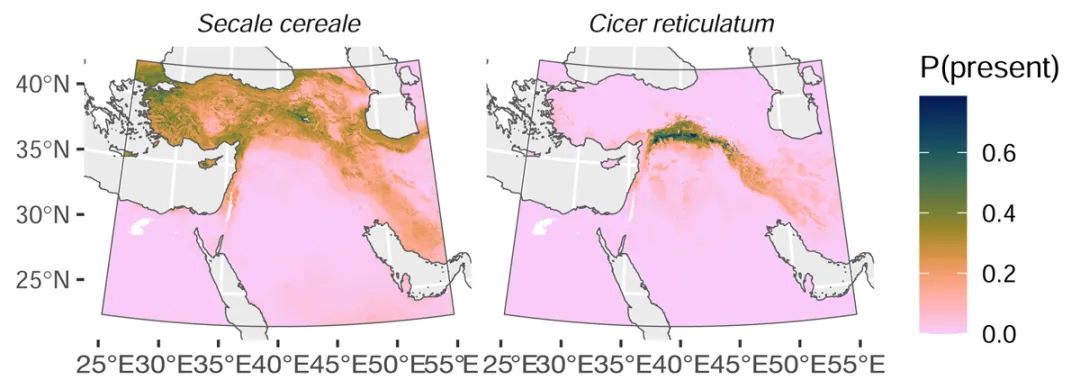图4 模拟的野生鹰嘴豆和黑麦在早全新世时期的分布范围
