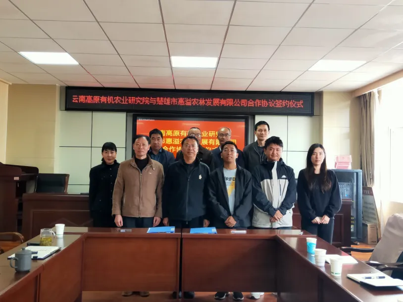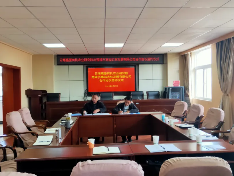 2026年2月28日上午,云南高原有机农业研究院(以下简称 “研究院”)常务副院长赵昶灵博士、教授、博士生导师、博士后(合作)导师在研究院四楼会议室主持了研究院与楚雄市惠溢农林发展有限公司(以下简称“惠溢公司”)针对《中国林下彝药示范基地用地合作协议》的签订仪式。楚雄市乡村产业发展中心丁桂学主任、惠溢公司李成董事长、周德金总经理、李睿副总经理、综合行政部钟宜璇主任和工作人员苏凯立、服务站专家组骨干成员、楚雄技师学院、彝药大师郭乔仪高级讲师和全荣高级讲师应邀出席了签约仪式;赵昶灵教授的博士研究生王紫檀同学和硕士研究生李仕江同学担任签约仪式秘书。