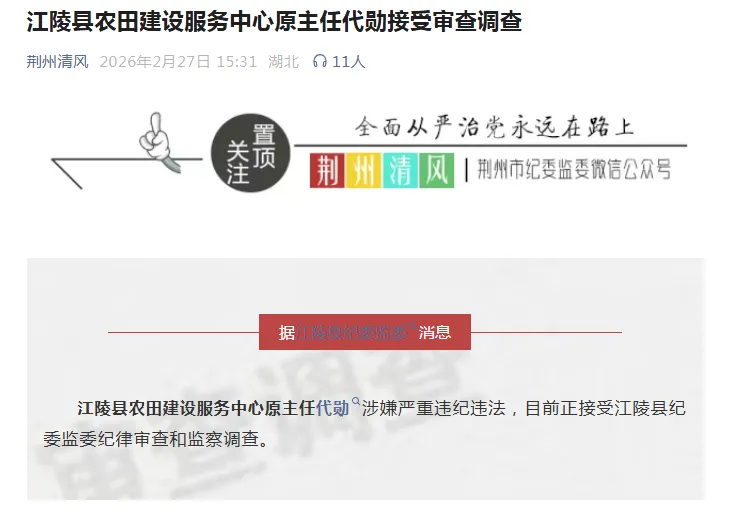 据江陵县纪委监委2月27日消息:江陵县农田建设服务中心原主任代勋涉嫌严重违纪违法,目前正接受江陵县纪委监委纪律审查和监察调查。公开信息显示,代勋曾担任江陵县农田建设服务中心主任,该中心承担农田建设、项目管理等相关职责。另据阳新县纪委监委2月26日消息:阳新县农业农村局畜牧兽医服务中心动物卫生监督股原股长汪顺文涉嫌严重违纪违法,目前正接受阳新县纪委监委纪律审查和监察调查。汪顺文长期在畜牧兽医系统工作,曾任动物卫生监督股股长,负责动物防疫检疫、卫生监督等工作。目前,两人的具体违纪违法问题正在调查中。来源:凤凰网湖北