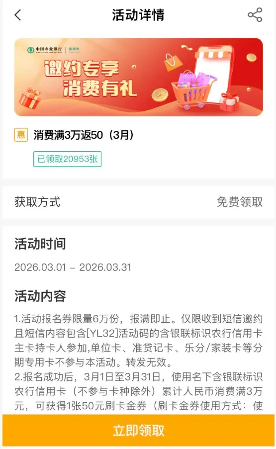 农业银行3月月月刷收尾,立减金最后领取