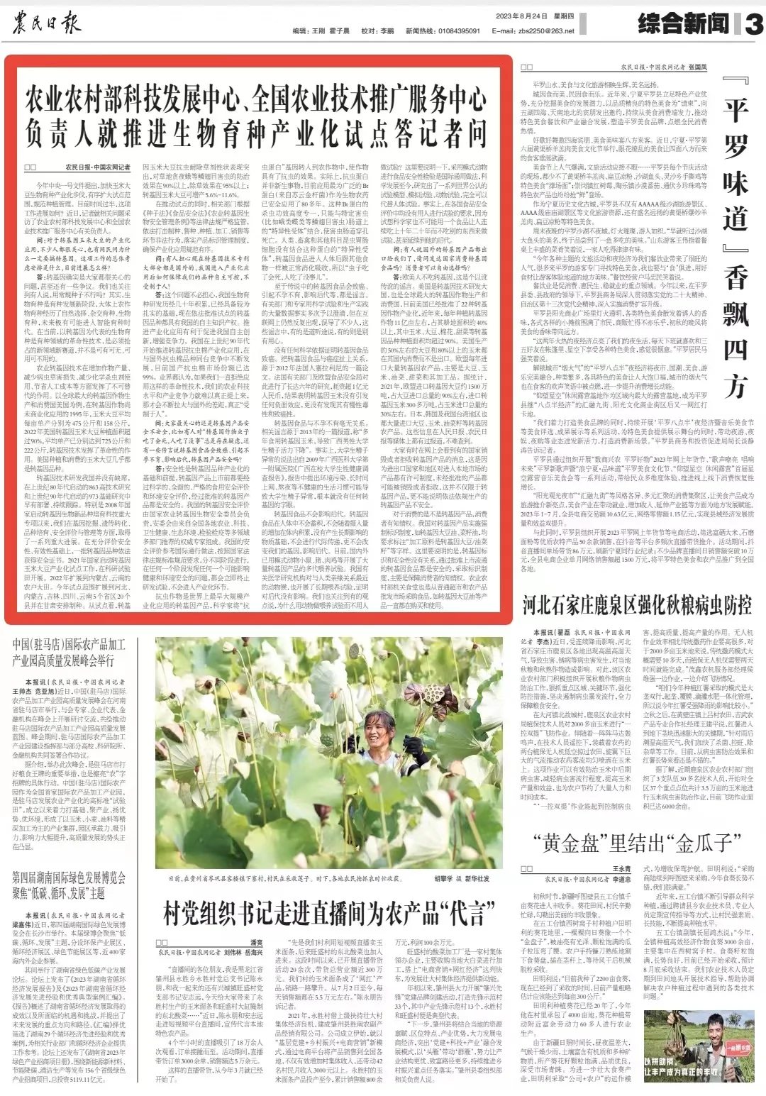 问:对于转基因玉米大豆的产业化应用,不少人都很关心,也有网民问为什么一定要搞转基因。这项工作的总体考虑安排是什么,目前进展怎么样?答:转基因确实是大家都很关心的问题,甚至还有一些争议。我们也关注到有人说,用常规种子不行吗?其实,生物育种是育种发展新阶段,大体上农作物育种经历了自然选择、杂交育种、生物育种,未来极有可能进入智能育种时代。在当前,以转基因为代表的生物育种是育种领域的革命性技术,是必须抢占的新领域新赛道,并不是可有可无、可用可不用的。农业转基因技术在增加作物产量、减少病虫草害损失、减少化学杀虫剂使用、节省人工成本等方面发挥了不可替代的作用。以全球最大的转基因作物生产和消费国美国为例,在转基因作物尚未商业化应用的1995年,玉米大豆平均每亩单产分别为475公斤和158公斤,2022年美国转基因玉米大豆种植面积超过90%,平均单产已分别达到725公斤和222公斤,转基因技术发挥了革命性的作用。美国种植和消费的玉米大豆几乎都是转基因品种。转基因技术研发我国并没有缺席,在上世纪80年代启动的863高技术研究和上世纪90年代启动的973基础研究中早有部署、持续跟踪。特别是2008年国家启动转基因生物新品种培育科技重大专项以来,我们在基因挖掘、遗传转化、品种培育、安全评价与管理等方面,取得了一系列重大进展。在充分评价安全性、有效性基础上,一批转基因品种依法获得安全证书。2021年国家启动转基因玉米大豆产业化试点工作,在科研试验田开展。2022年扩展到内蒙古、云南的农户大田。今年试点范围扩展到河北、内蒙古、吉林、四川、云南5个省区20个县并在甘肃安排制种。从试点看,转基因玉米大豆抗虫耐除草剂性状表现突出,对草地贪夜蛾等鳞翅目害虫的防治效果在90%以上,除草效果在95%以上;转基因玉米大豆可增产5.6%-11.6%。在推动试点的同时,相关部门根据《种子法》《食品安全法》《农业转基因生物安全管理条例》等法律法规严格监管,依法打击制种、售种、种植、加工、销售等环节非法行为,落实产品标识管理制度,确保产业化应用规范有序。问:有人担心现在转基因技术专利大部分都是国外的,我国进入产业化应用后如何保障我们的品种自主可控,不受制于人?答:这个问题不必担心,我国生物育种研发历经几十年积累,已经具备较为扎实的基础,现在依法批准试点的转基因品种都具有我国的自主知识产权。推进产业化应用有利于促进我国自主创新,增强竞争力。我国在上世纪90年代开始推进转基因抗虫棉产业化应用,在与国外抗虫棉品种同台竞争中不断发展,目前国产抗虫棉市场份额已达99%。业界都认为,如果我们一直拒绝应用这样的革命性技术,我们的农业科技水平和产业竞争力就难以真正提上来,那才会不断拉大与国外的差距,真正“受制于人”。问:大家最关心的还是转基因产品安全不安全,比如有人对“转基因作物虫子吃了会死,人吃了没事”总是存在疑虑,还有一些传言说转基因食品会致癌、引起不孕不育、影响后代,转基因产品安全吗?答:安全性是转基因品种产业化的基础和前提,转基因产品上市前都要经过科学的、全面的、严格的食用安全评价和环境安全评价,经过批准的转基因产品都是安全的。我国的转基因安全评价由国家农业转基因生物安全委员会负责,安委会由来自全国各地农业、科技、卫生健康、生态环境、检验检疫等多领域多部门推荐的权威专家组成。我国的安全评价参考国际通行做法,按照国家法律法规标准规范要求,分不同阶段进行,在任何一个阶段发现任何一个可能影响健康和环境安全的问题,都会立即终止研发试验,不会进入产业化环节。抗虫作物是世界上最早大规模产业化应用的转基因产品,科学家将“抗虫蛋白”基因转入到农作物中,使作物具有了抗虫的效果。实际上,抗虫蛋白并非新生事物,目前应用最为广泛的Bt蛋白(来自苏云金杆菌)作为生物农药已安全应用了80多年。这种Bt蛋白的杀虫功效高度专一,只能与特定害虫(比如蛾类蝶类等鳞翅目害虫)肠道上的“特异性受体”结合,使害虫肠道穿孔死亡。人类、畜禽和其他科目昆虫胃肠细胞没有结合这种蛋白的“特异性受体”,转基因食品进入人体后跟其他食物一样被正常消化吸收,所以“虫子吃了会死,人吃了没事儿”。至于传说中的转基因食品会致癌、引起不孕不育、影响后代等,都是谣言。有关部门和专家用科学试验和生产实践的大量数据事实多次予以澄清,但在互联网上仍然反复出现,误导了不少人,这些谣言中,有的是道听途说,有的则是别有用心。没有任何科学依据证明转基因食品致癌。把转基因食品与癌症扯上关系,源于2012年法国人塞拉利尼的一篇论文。法国有关部门及欧盟食品安全局对此进行了长达六年的研究,耗资超1亿元人民币,结果表明转基因玉米没有引发任何负面效应,更没有发现其有慢性毒性和致癌性。转基因食品与不孕不育毫无关系。相关谣言源于2013年的一篇报道,称“多年食用转基因玉米,导致广西男性大学生精子活力下降”。事实上,大学生精子异常的说法出自2009年广西医科大学第一附属医院《广西在校大学生性健康调查报告》,报告中提出环境污染、长时间上网、熬夜等不健康的生活习惯可能导致大学生精子异常,根本就没有任何转基因的字眼。转