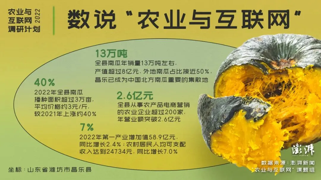 贝贝南瓜是近年国内流行起来的一种“网红”蔬菜,个头不大,呈圆形状,中间粗两头细。由于此品种的南瓜含淀粉量高,口感近似板栗,但又比板栗甜且软糯。这类南瓜目前在国内的主要种植区和集散地,是位于山东省潍坊市的昌乐县。昌乐县紧挨着有名的“蔬菜之乡”寿光市,两地都隶属于潍坊市。此前,昌乐较为知名的农产品是“昌乐西瓜”,近年来,随着拼多多等电商在当地推动“产地直销”,贝贝南瓜产业顺势而为,成为继昌乐西瓜和甜瓜之后,当地另一主导农业产业。贝贝南瓜已经成为带动当地农业现代化、以及农村致富的“新兴产业”。据昌乐县农业农村局提供的数据显示,按照农业部门统计口径,昌乐虽然是在2010年左右才开始种植贝贝南瓜,但2018年当地的种植面积就突破了1万亩,2020年超过2万亩。2022年,贝贝南瓜播种面积预计超过3万亩,平均价格约3元/斤,价格波动在1.8~4.5元之间,较去年上涨约40%。另一方面,全县年南瓜销量大概在13万吨左右,产值超过8亿元,其中,外地南瓜占比接近50%,昌乐已成为中国北方南瓜重要的集散地,销售渠道仍以瓜菜经纪人为主。昌乐并不是国内最早引进贝贝南瓜的地区,但是贝贝南瓜为何能在当地兴起,成为农户们首选种植的农产品,背后有哪些主导因素?又给当地带来了哪些变化?