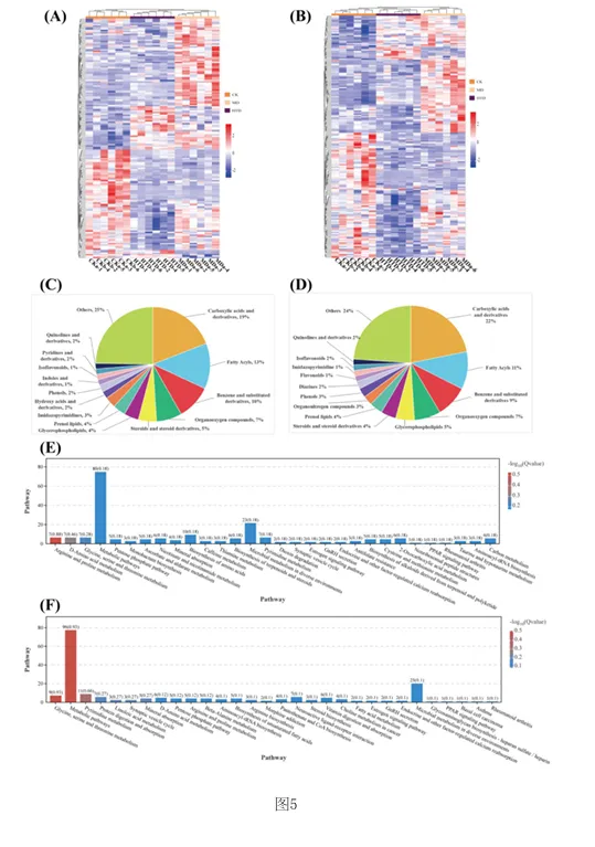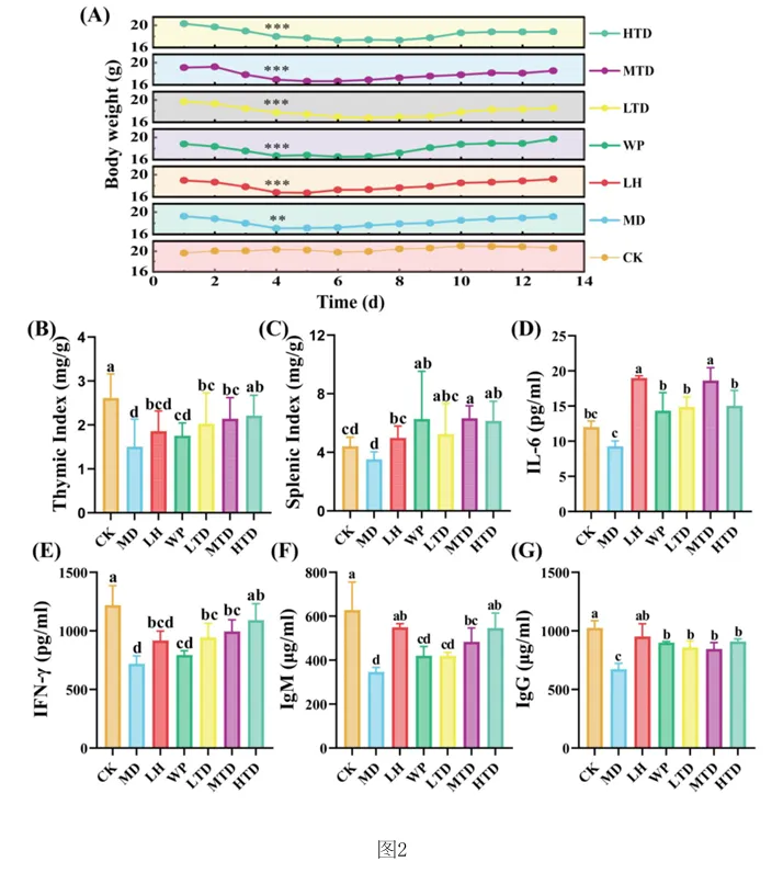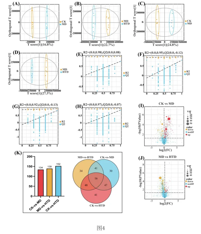 1.专利号:CN121489044A,专利名称:红茶与核桃肽复合物及其制备和应用,申请日:2025.09.18,公布(开)日:2026.02.10,申请人:湖南农业大学本发明公开了红茶与核桃肽复合物及其制备方法和在缓解环磷酰胺诱导的免疫抑制中的应用。研究发现,FT‑WP治疗显著逆转环磷酰胺诱导的小鼠的体重、胸腺和脾脏指数,改善空肠CD4+T细胞亚群平衡,以及平衡细胞因子和免疫球蛋白的水平。此外,研究表明, FT‑WP影响甘氨酸、丝氨酸和苏氨酸代谢、嘧啶代谢、蛋白质消化和吸收代谢等代谢途径和胆碱、 三甲基胺‑N‑氧化物、丙硫菌唑、硬脂酰肉碱、前列腺素F2.β等代谢物的调节。红茶与核桃肽复合型食品可缓解环磷酰胺诱导的免疫抑制,调节异常的血清代谢。1.2.1 FT‑WP对免疫抑制小鼠体重和脏器指数的影响小鼠体重的体重变化如图2中(A)所示。结果显示空白组(CK)小鼠体重在实验过程 中呈正常上升趋势,而注射环磷酰胺3天后,模型组(MD)(P<0.01),盐酸左旋咪唑组(LH)、核 桃肽组(WP)和低、中、高剂量组(LTD、MTD、HTD)(P<0.001)小鼠体重极显著下降,说明模型建 立成功,环磷酰胺对小鼠机体损伤严重。 [0070] 连续10天灌胃盐酸左旋咪唑,核桃肽、和不同剂量的FT‑WP后,小鼠体重均能较好 的恢复,提示阳性药物组(LH)、核桃肽组(WP)、和低、中、高剂量组(FT‑WP)可减轻环磷酰胺 所致肝损伤小鼠体重的下降。胸腺指数、脾脏指数如图2中(B)、(C)所示,在14天的喂养期 后,与空白组(CK)相比,环磷酰胺诱导小鼠胸腺指数显著降低(p<0.05),说明环磷酰胺可以 破坏免疫器官的功能。与模型组(MD)相比,FT‑WP组胸腺指数和脾脏指数均显著升高(p< 0.05),提示FT‑WP可改善环磷酰胺诱发的免疫器官损伤。1.2.2 FT‑WP对免疫抑制小鼠脾脏及空肠组织病理变化的影响脾脏是重要的免疫器官,用环磷酰胺处理的小鼠的免疫状况可以通过检查脾脏的组织学结构来评估。如图3中(A)和(B)所示,空白组(CK)细胞排列整齐紧密,白细胞数量较多;脾小结发育良好,结构清晰,白髓和红髓界限明显,边缘区无增生,生发中心极少。与空 白组(CK)相比,模型组(MD)被膜增厚进入到脾实质内形成小粱,边缘区增生明显,边缘区增多增厚,脾小结受损严重,淋巴样滤泡增生导致白髓与红髓界限模糊。白髓异常萎缩,说明淋巴组织受损,淋巴细胞数量减少,生发中心数量较多,脾小结破损严重,红髓区充血严重。 与模型组(MD)相比,高剂量组(HTD)组生发中心不明显,边缘区厚度与模型组(MD)相比明显减少,红髓有轻微充血,白髓面积增大且内部淋巴细胞排列较密集,白髓和红髓分布比例趋近于正常组;核桃肽组(WP)、低剂量组(LTD)、中剂量组(MTD)和组脾脏的边缘区和白髓数量均有明显改善,但不及高剂量组(HTD)的恢复效果明显。CD4+T细胞是重要的免疫细胞,在接受抗原刺激后可分化为Th细胞的不同亚型并执行各种功能。环磷酰胺可通过抑制T细胞分化影响小鼠肠道免疫状态。因此,通过免疫组织化学研究了各组中 CD4+ T 细胞的面积。如图3中(B)所示,CD4+T细胞被染色成棕色。很直观可见空白组和各给药组棕色细胞较多,模型组几乎无棕色细胞。MD组CD4+T细胞表达明显低于CK组(P<0.05)。FT‑WP灌胃后CD4+T水平显著升高(P<0.05),HTD组升高幅度最高。因此,FT‑WP可以有效改善环磷酰胺诱导的空肠免疫中CD4+T细胞水平的平衡。1.2.3 FT‑WP对免疫抑制小鼠血清生化指标的影响 细胞因子主要是由免疫细胞或其他刺激物诱导的小分子可溶性蛋白质,参与不同的免疫功能。基于上述发现,我们进一步研究了血清中炎性细胞因子和免疫因子IL‑6、IFN γ 、IgM、IgG 水平如图2(D‑G)所示,与CK组相比,MD组中血清中IL‑6、IFN‑ γ 、IgM、IgG水平显著降低(p<0.05);与MD组相比,LH组、WP组、和FT‑WP组血清IL‑6、IFN‑ γ 、IgM和IgG水平显著升高(p<0.05);并且在高剂量下有更好的效果。说明Cy能显著抑制小鼠免疫因子分泌, LH、WP、和FT‑WP 治疗在一定程度上逆转了免疫因子的减少。1.2.4 FT‑WP对免疫抑制小鼠血清代谢的调节作用 基于前面实验结果分析发现,FT‑WP高剂量(HTD)研究效果最佳。通过超高效液相色谱‑质谱法进行非靶向代谢组学进一步分析,比较CK组、MD组和HTD组血清中的代谢物。在阳离子(图4中A和B)和阴离子模式下(图4C和D),正交偏最小二乘判别分析(OPLS‑DA)分析显示,MD组与CK组和HTD组明显分开,表明MD组的血清代谢物与CK组和HTD组相比有显著差异。以及在阳离子(图4E和F)和阴离子模式下(图4中G和H)置换检验分析中,所有经过置换后的Q2值均低于原始模型的Q2值,表明该模型预测结果可靠,具有较好的解释和预测能力, 不存在过拟合,本实验可继续后续分析。在混合模式下,采用VIP>2,P<0.05的选择标准;| log2倍数变化|>1,火山图表明,与CK组相比,MD组诱导了134种代谢物的变化,其中82种代谢物显著上调,52种代谢物显著下调(图4中I)。此外,与MD组相比,HTD组诱导了139种代谢物的变化,其中20种代谢物上调,119种代物下调(图4中J)。CK组与MD组、MD组与HTD组以及 CK组与HTD组的差异代谢物数量分别为134、139、152(图4中K)。分层聚类热图分析显示,三组之间的血清代谢物谱存在显著差异(图5中A和B)。这 些差异代谢物分别在HMDB数据库和KEGG数据库中进行分类。基于HMDB,CK与MD,MD与HTD相比前四个类别是羧酸及其衍生物、脂肪酰基、苯及其取代衍生物、有机氧化合物,各占9%以上(图5中C和D)。KEGG富集分析显示,根据化合物数量,富集途径排名前三位的是