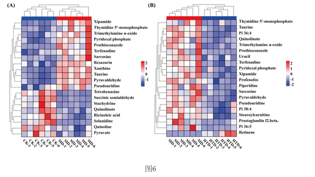 选择基于OPLS‑DA模型具有前20个差异代谢物作为潜在的生物标记物(VIP > 2)。 如热图6(A) 所示,所有20种化合物在CK组和MD组之间表现出显著差异(p<0.05),与CK组相 比,MD组有12种化合物增加(希帕胺Xipamide、Thymidine 5'‑monophosphate胸腺嘧啶5’一 磷酸、Trimethylamine n‑oxide三甲基胺‑N‑氧化物、Pyridoxal phosphate磷酸吡哆醛、 Prothioconazole丙硫菌唑、Terfenadine特非那定、Sarcosine肌氨酸、Resazurin刃天青、 Xanthine黄嘌呤、Taurine牛磺酸、Pyruvaldehyde丙酮醛、Pseudouridine假尿(嘧啶核) 苷),其余8种化合物减少(Tetrabenazine四苯喹嗪、Succinic semialdehyde琥珀酸半醛、 Stachydrine水苏碱、Quinolinate羟基喹啉铜、Ricinoleic acid蓖麻油酸、Solanidine茄 啶、Quinoline喹啉、Pyruvate丙酮酸盐);如热图6(B)所示,HTD组和MD组之间表现出显著差 异(p<0.05),与MD组相比,HTD组有19种化合物减少(Thymidine 5'‑monophosphate胸腺嘧 啶5’一磷酸、Taurine牛磺酸、Pi 36:4、Quinolinate羟基喹啉铜、Trimethylamine n‑oxide 三甲基胺‑N‑氧化物、Prothioconazole、Uracil尿嘧啶、Terfenadine、Pyridoxal phosphate、Xipamide、Profenofos丙溴磷、Piperidine哌啶、Sarcosine、Pyruvaldehyde、 Pseudouridine、Pi 38:4、Stearoylcarnitine硬脂酰肉碱、Prostaglandin F2.β前列腺素 F2.β、Pi 36:5),一种化合物增加(Retinene视网醛)。其中, Xipamide、Thymidine 5' monophosphate、Trimethylamine n‑oxide、Pyridoxal phosphate、Prothioconazole、 Terfenadine、Sarcosine、Taurine、Pyruvaldehyde、Pseudouridine这10种代谢物在MD组显 示增加,而HTD有效改善环磷酰胺引起的代谢物水平的变化。在本研究中,环磷酰胺可诱导三甲基胺‑N‑氧化物(Trimethylamine n‑oxide, TMAO)水平升高,施用HTD,胆碱(Choline)含量降低。先前的研究表明,胆碱是三甲基胺‑N 氧化物的主要前体,胆碱被肠道微生物代谢成三甲胺(TMA),随后在肝脏氧化形成三甲胺‑ N‑氧化物。三甲基胺‑N‑氧化物与多种健康结果相关,包括全因死亡率、心血管疾病、高血压、糖尿病、癌症和肾功能疾病;三甲基胺‑N‑氧化物可以激活炎症途径,诱导活性氧(ROS) 产生,同时降低抗氧化活性,破坏细胞内氧化还原平衡;三甲基胺‑N‑氧化物会导致一系列生物功能障碍,包括氧化应激、血脑屏障破坏、突触可塑性降低、炎症、线粒体功能障碍和异常蛋白质聚集;三甲基胺‑N‑氧化物已被证明通过诱导神经元衰老和加剧神经炎症和氧化应激加速大脑衰老和认知能力下降。先前的研究表明,丙硫菌唑(Prothioconazole)诱导线粒体功能障碍,可导致氧化应激和细胞凋亡,引起一些不良心血管效应,并对早期生命阶段 的斑马鱼产生发育毒性。然而灌胃FD‑WP后,胆碱含量下降,在受FD‑WP调控的代谢产物中, 与MD组相比,FD‑WP降低了三甲基胺‑N‑氧化物和丙硫菌唑水平,这表明FD‑WP可以改善环磷酰胺诱导的免疫损伤。 [0084] 与MD组相比,FD‑WP(HTD组)降低了前列腺素F2.β(Prostaglandin F2.β)、硬脂酰肉碱(tearoylcarnitine)的水平。前列腺素(PG)通过影响炎症、血管生成和免疫抑制的复杂信号通路在皮肤癌以及黑色素瘤的发病机制中起关键作用。前列腺素F2.β是前列腺素F2系列的一种异构体,属于异前列腺素类化合物。除了作为氧化应激的生物标志物外,它还充当维持生理功能稳态的介质,并参与与疾病病理过程相关的炎症和免疫反应的生物活性。 硬脂酰肉碱是一种脂肪酯类脂质分子,属于人体内源性代谢物。它在生物体内发挥着重要的角色,例如,可以作为早发先兆子痫和迟发先兆子痫的代谢组学代谢标志物。此外,硬脂酰肉碱在灌注大鼠心脏的脂肪酸链延长过程中,可以由灌注的棕榈酸酯合成而来,有研究进行多组学分析显示硬脂酰肉碱是妊娠糖尿病大鼠后代心脏代谢疾病发展的一种新的生物标志物。在HIV感染者的研究中发现,血浆中酰基肉碱的积累与这些患者在抗逆转录病毒疗法(ART)后的免疫恢复不良有关。有趣的是,MD组显示水苏碱水平下降。有研究表明水苏碱(Stachydrine)在心脑血管疾病、神经保护、抗癌、子宫调节、抗炎反应、肥胖治疗和呼吸系统疾病等方面有着重要作用。不幸的是,给药FD‑WP并没有显著改变水苏碱水平,但通过调节胆碱、三甲基胺‑N‑氧化物、丙硫菌唑、硬脂酰肉碱、前列腺素F2.β等代谢物减轻了免疫 损伤