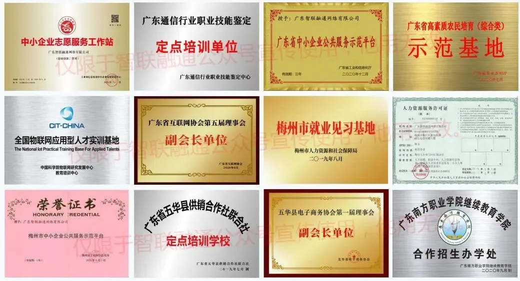 公司是工信部中小企业发展促进中心中小企业志愿服务工作站、广东省高素质农民培育(综合类)示范基地、广东省中小企业公共服务示范平台、广东省乡村休闲产业发展智库咨询机构(第一批)等。具备农业技术培训与推广、电子商务技术培训与推广、人才培训、人力资源服务等资质,为省内超30个政府单位、企业提供了人才联合培养、高技能职业培训服务及人力资源服务。
