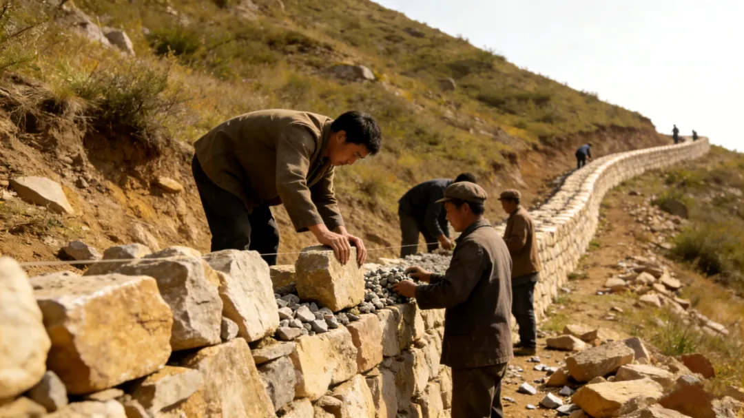 峡口右侧是陡峭石山,左侧便是施工面。一开始,一部分人挥锤打钎,每隔几米凿一个炮眼;一部分人挥镐挖槽,清理砌坎根基。根基成型、炮眼够数,便开始第一轮放炮——没有石头,砌坎就成了无米之炊。