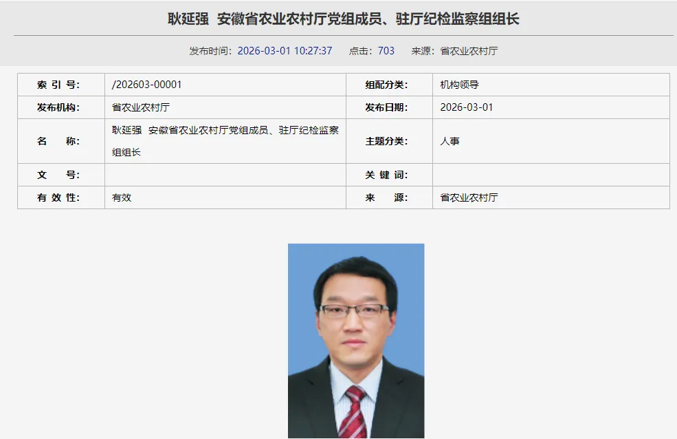 据安徽省农业农村厅官网更新显示:耿延强已任安徽省农业农村厅党组成员、驻厅纪检监察组组长。