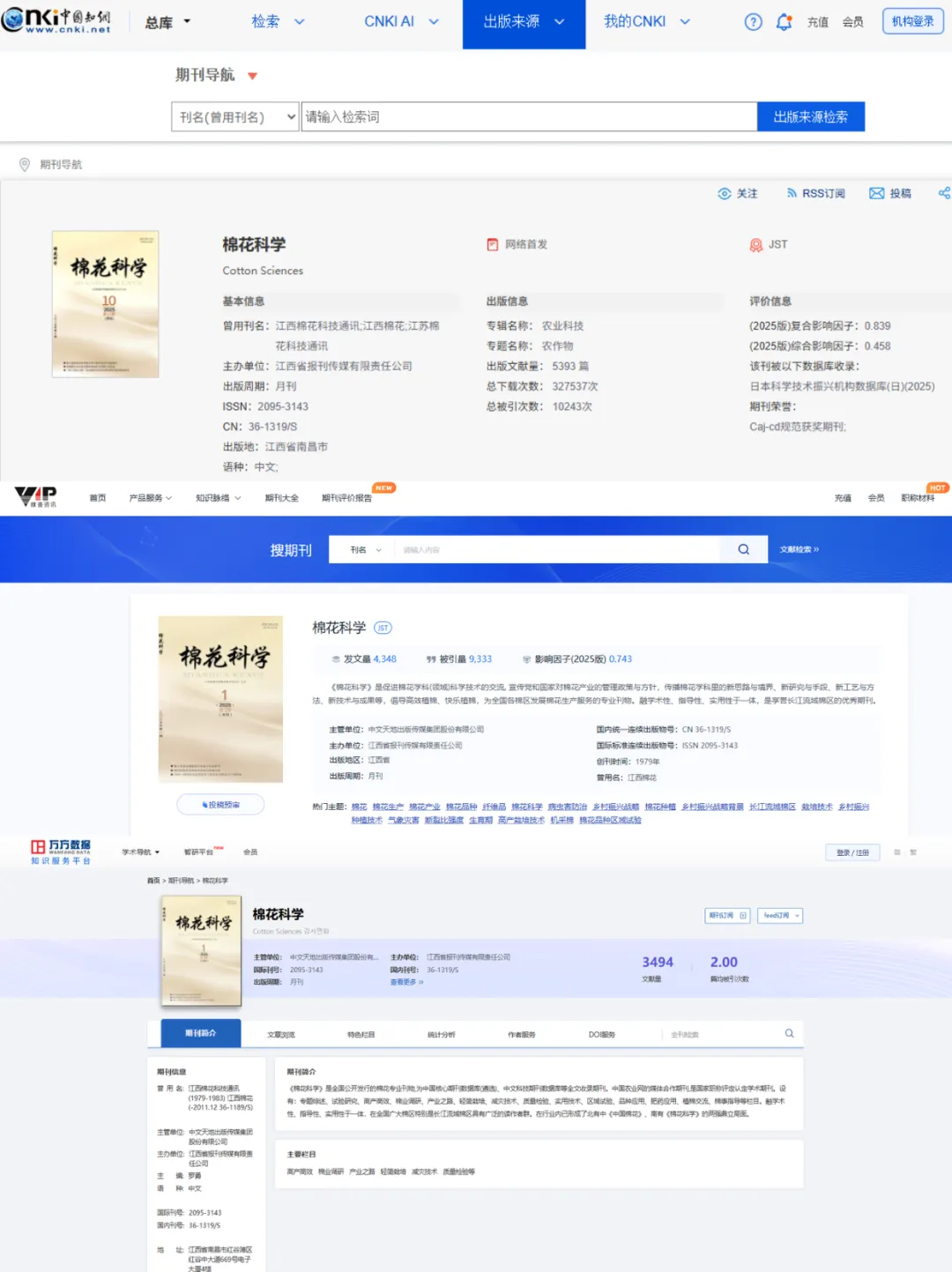 《棉花科学》JST,第一批学术目录,省级,月刊,知网 万方 维普收录,引用知网(2025版)复合影响因子:0.839,刊期:26年7-8月,版面字符: 5500字符3版,主办单位:江西省报刊传媒