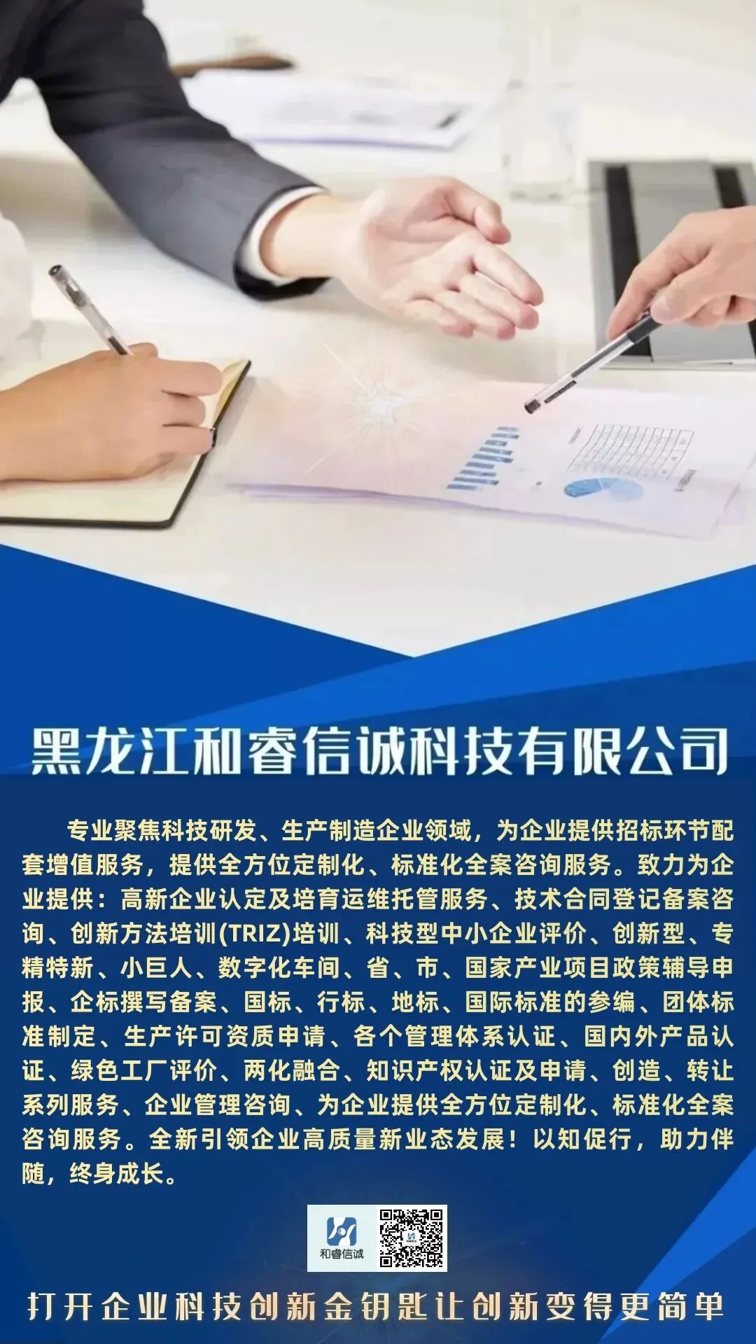 黑龙江和睿信诚科技有限公司为企业提供:高新、科小、创新型、专精特新小巨人、数字化车间等认定、评价、申报及政策辅导;企业标准撰写备案、国、行、地、团标准的参编、制定等服务;各个管理体系认证、国内外产品认证;绿色工厂评价、两化融合、知识产权实缴;专利、商标申请与转让系列服务;企业管理咨询等;为企业提供全方位定制化、标准化全案咨询服务等等。