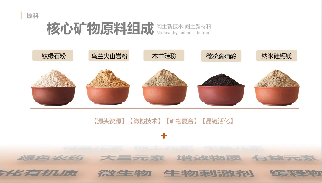 而我们——专注用新材料解决土壤问题的企业,做的正是这件事:持续补充钛、锶、镁、硅、铁等70种矿物质元素。这不是传统化肥,而是土壤的“生命骨架”。硅强健作物细胞,镁驱动光合作用,微量元素让作物自带免疫力。