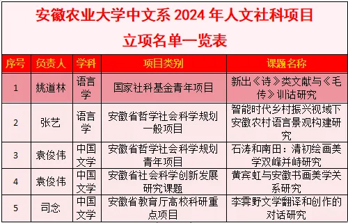 在2024年度人文社会科学项目立项工作中,安徽农业大学中文系教师科研申报成效显著,共获批国家社科基金青年项目1项,以及多项省级、厅级人文社科项目,立项层级与研究质量实现进一步提升。相关研究紧扣语言文献、文学美学、书画艺术与乡村语言景观等方向,充分展现了中文系科研队伍不断增强的学术实力与研究潜力。