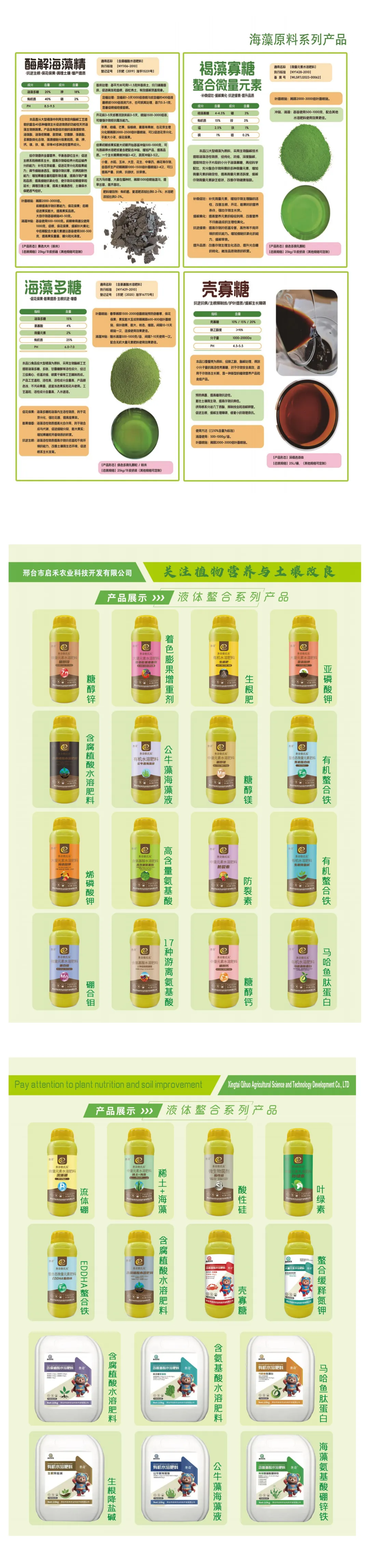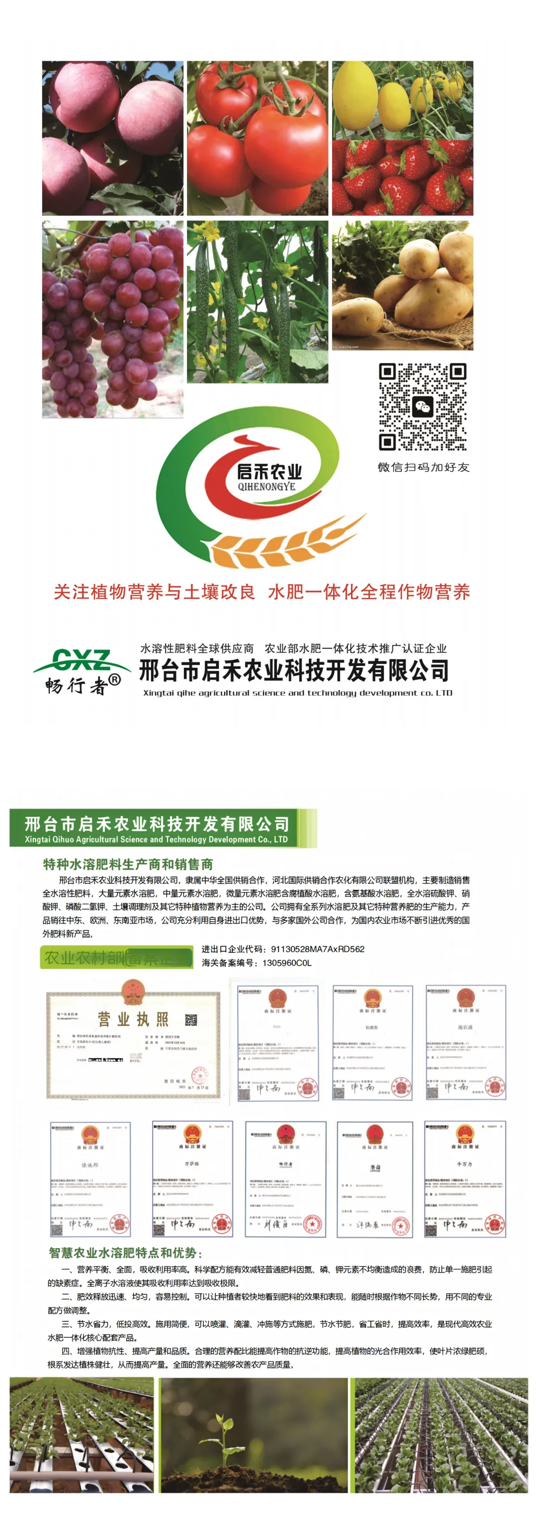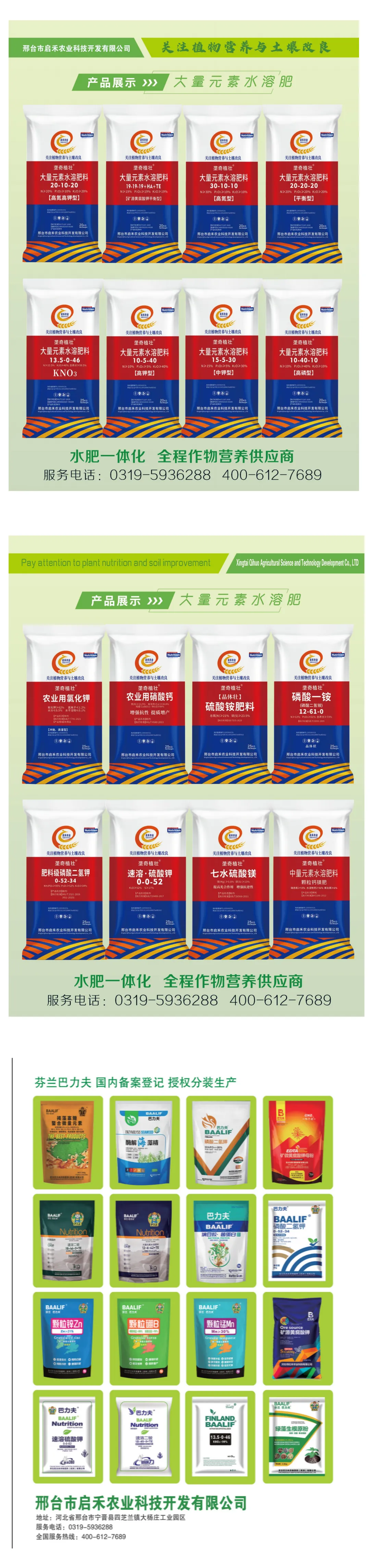 邢台市启禾农业科技开发有限公司,隶属中华全国供销合作,河北国际供销合作农化有限公司联盟机构,主要制造销售全水溶性肥料,大量元素水溶肥,中量元素水溶肥,微量元素水溶肥含腐植酸水溶肥,含氨基酸水溶肥,全水溶硫酸钾、硝酸钾、磷酸二氢钾、土壤调理剂及其它特种植物营养为主的公司。公司拥有全系列水溶肥及其它特种营养肥的生产能力,产品销往中东、欧洲、东南亚市场,公司充分利用自身进出口优势,与多家国外公司合作,为国内农业市场不断引进优秀的国外肥料新产品。