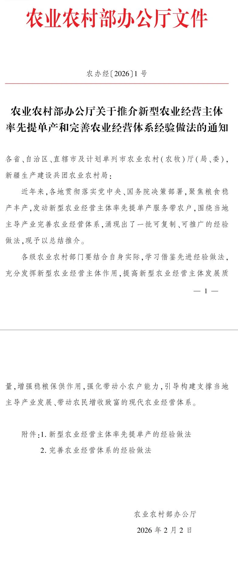 >红头文件通知:丨农业农村部办公厅关于推介新型农业经营主体率先提单产和完善经营体系经验做法的通知