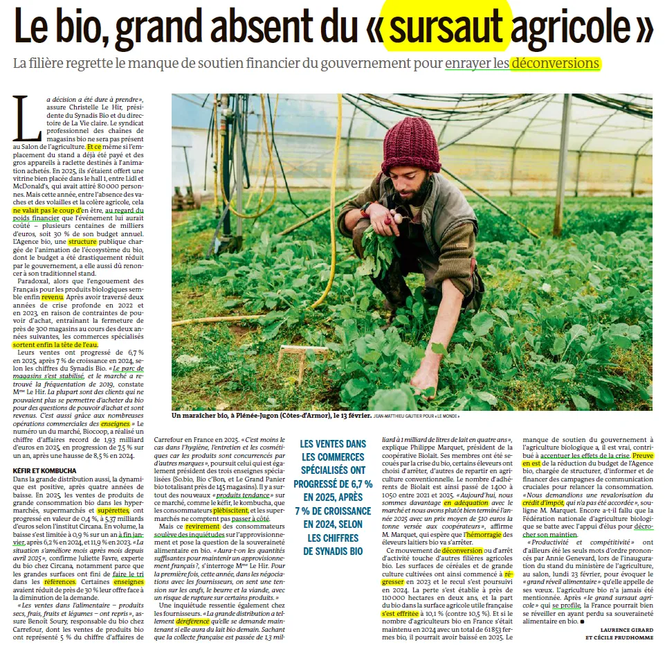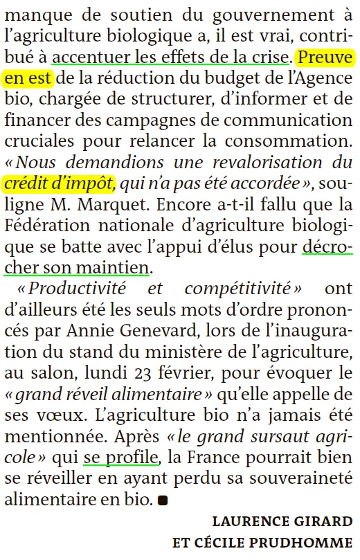 2月23日星期一,在博览会上的农业部展位揭幕仪式上,安妮·热纳瓦在谈及她所期盼的"粮食大觉醒"时,提到的唯一口号就是"生产力和竞争力"。有机农业从未被提及。在即将到来的"农业大觉醒"之后,法国很可能将面临一个缺失了有机农业的未来。