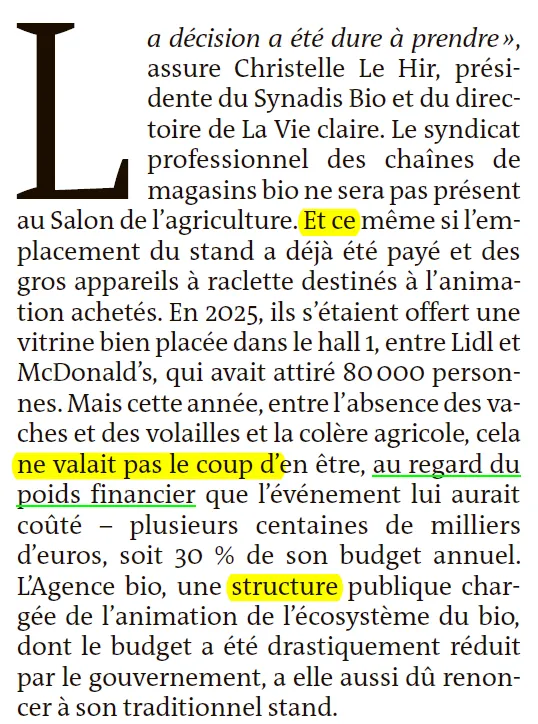 "这个决定很难做出," 法国有机品牌连锁协会(Synadis Bio)及La Vie claire公司董事会主席克里斯泰勒·勒伊尔确认道。这个有机商店连锁行业的专业工会将不会参加本届农业博览会。尽管展位的费用已经支付,用于活跃气氛的大型烤奶酪机也已经购买。2025年,他们曾在1号展厅的Lidl和麦当劳之间占据过一个位置极佳的展示位,吸引了8万名参观者。但今年,考虑到参加此次活动所需承担的财务压力——数十万欧元,相当于其年度预算的30%——加之奶牛和家禽的缺席以及农业界的愤怒情绪,参展已不值当。负责推动有机产业发展、其预算被政府大幅削减的公共机构——法国有机农业局,也不得不放弃了其传统的展位。