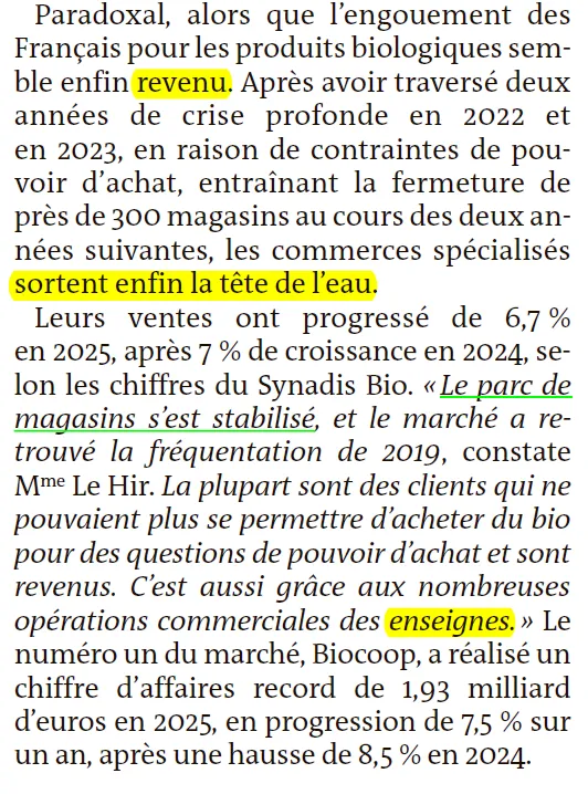 这显得有些 paradoxical(矛盾),因为法国人对有机产品的热情似乎终于回归了。在2022年和2023年经历了两年的深度危机(由于购买力限制,导致随后两年内有近300家门店关闭)之后,专营店终于摆脱困境,重见天日。