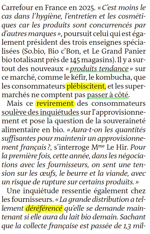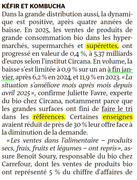 "食品类——干货、生鲜、果蔬——的销售已经恢复," 卡彭希尔先生证实道,他负责监督2025年法国Carrefour(家乐福)的有机转型。"而在卫生、清洁和化妆品领域情况就没那么好,因为这些产品受到其他品牌的竞争," 这位同时也是三家专营连锁店(So.bio、Bio c'Bon 和 Le Grand Panier bio,合计近145家门店)的总裁继续说道。这个市场上还出现了一些消费者青睐的"流行"新品,如开菲尔、康普茶,超市自然不会错过这些机会。