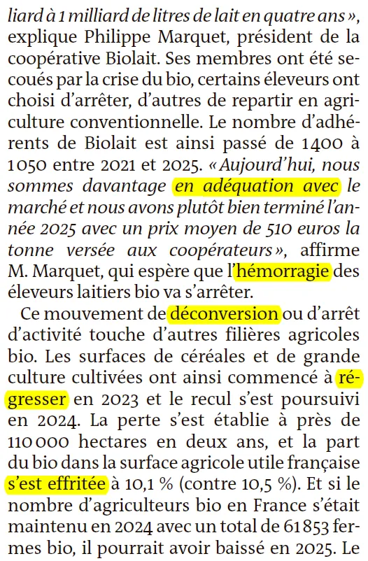 这种"去转换"或停止生产的动向也影响了其他有机农业领域。有机谷物和大田作物的种植面积从2023年开始减少,并在2024年持续下滑。两年内损失了近11万公顷,有机面积占法国有用农业面积的比例下降至10.1%(之前为10.5%)。如果说有什么事情加剧了危机的影响,那无疑是政府对有机农业支持的缺失。负责构建、宣传和为刺激消费至关重要的传播活动提供资金的法国有机农业局预算被削减就是证明。"我们要求提高税收抵免,但未获批准," 马尔凯先生强调道。而且,全国有机农业联合会还需要在与民选代表的共同努力下,才艰难地争取到了该抵免政策的保留。