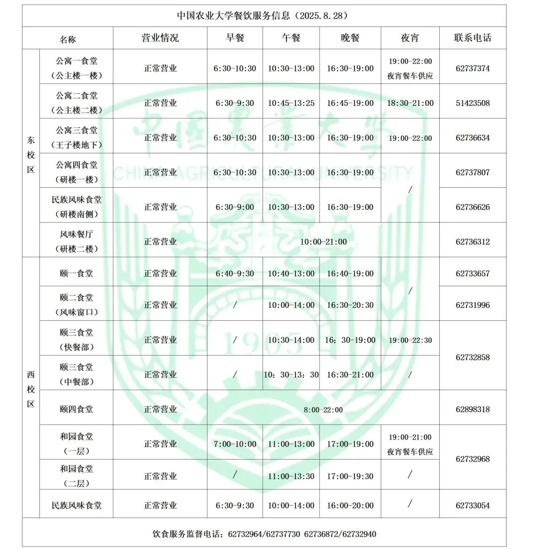 附食堂营业时间表,注:中农的食堂不是全天营业的,大家来的时候注意看时间!
