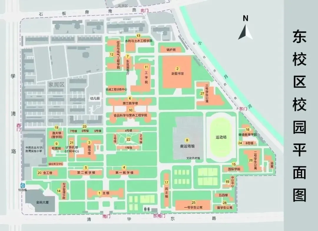 去东校区导航“中国农业大学正门或东南门”进入校园内,去西校区导航“中国农业大学正门或西北门”进入校园内。各个学院的具体位置可以直接在手机地图上输入就能导航到。
