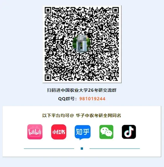 中农26考研交流QQ群:981019244,已经给大家建好啦,群内有中农历年上岸情况汇总,还会有上岸师兄师姐日常考研答疑,想超人一步的宝子可以进群获取哟~