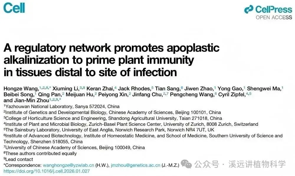 近日,山东农业大学园艺科学与工程学院青年教师李秀明副教授以共同第一作者身份在国际顶尖学术期刊《细胞》(Cell)在线发表题为“A regulatory network promotes apoplastic alkalinization to prime plant immunity in tissues distal to site of infection”的研究论文。