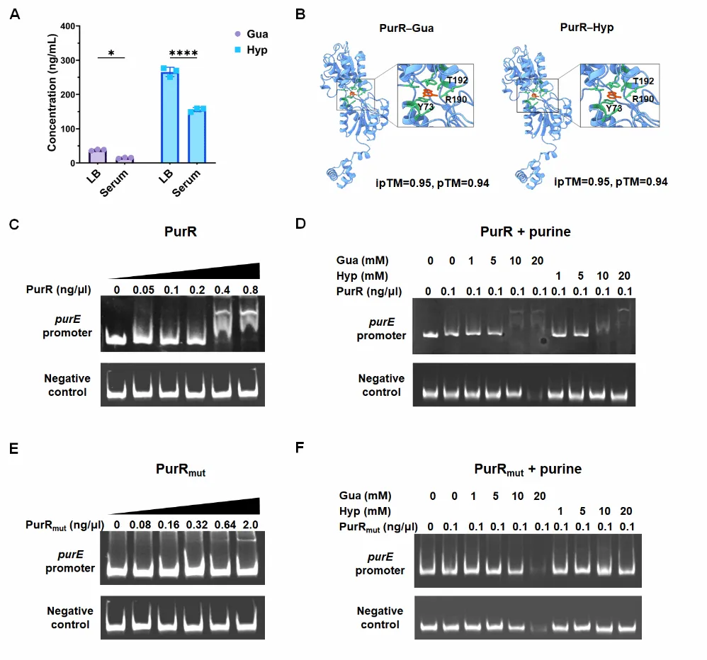 ExPEC是严重危害人和动物健康的病原菌,可引发脑膜炎、肺炎、尿路感染和败血症等,发病率和死亡率高,且耐药形势严峻,被世界卫生组织列为需优先控制的重点病原体。ExPEC能够在宿主血液中快速增殖并播散至全身,是其致病的重要基础,但其适应血液环境的具体机制仍有待阐明。本研究通过构建转座子突变文库,筛选出18个血清增殖必需基因,其中从头核苷酸生物合成通路显著富集。体内外研究显示,该通路不影响环境耐受和黏附能力,但减弱其在巨噬细胞内存活。进一步研究表明,核苷酸代谢通路在血清及动物体内均呈现显著的上调趋势。机制解析显示:当细菌处于血液中游离核苷酸匮乏的环境时,胞内嘌呤水平下降; PurR作为核苷酸代谢的关键负转录调控因子随后感应到嘌呤营养物质的匮乏信号后,解除对下游基因的阻遏,从而启动了核苷酸的从头合成途径。该动态调控机制增强了ExPEC对血液环境的适应能力,从而提升了其体内存活与致病能力。