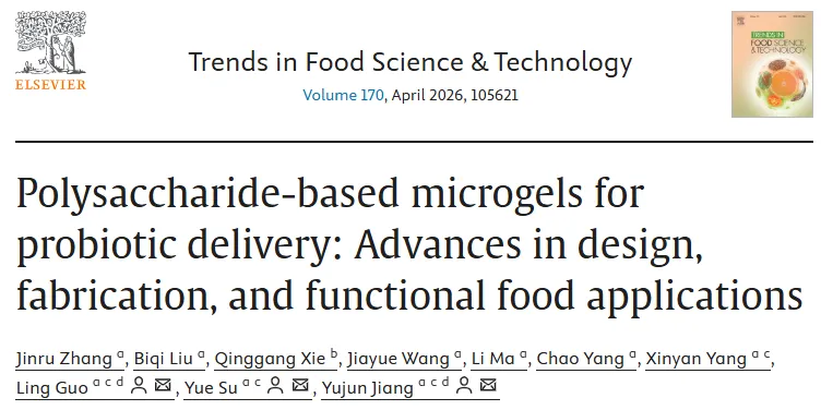 近日,东北农业大学郭鸰教授、姜毓君教授团队在国际食品Top期刊《Trends in Food Science & Technology》(Q1,IF: 15.4)发表题为“Polysaccharide-Based Microgels for Probiotic Delivery: Advances in Design, Fabrication, and Functional Food Applications”的综述型论文。东北农业大学硕士研究生张金茹为第一作者,通讯作者为东北农业大学乳品科学教育部重点实验室郭鸰教授和姜毓君教授。