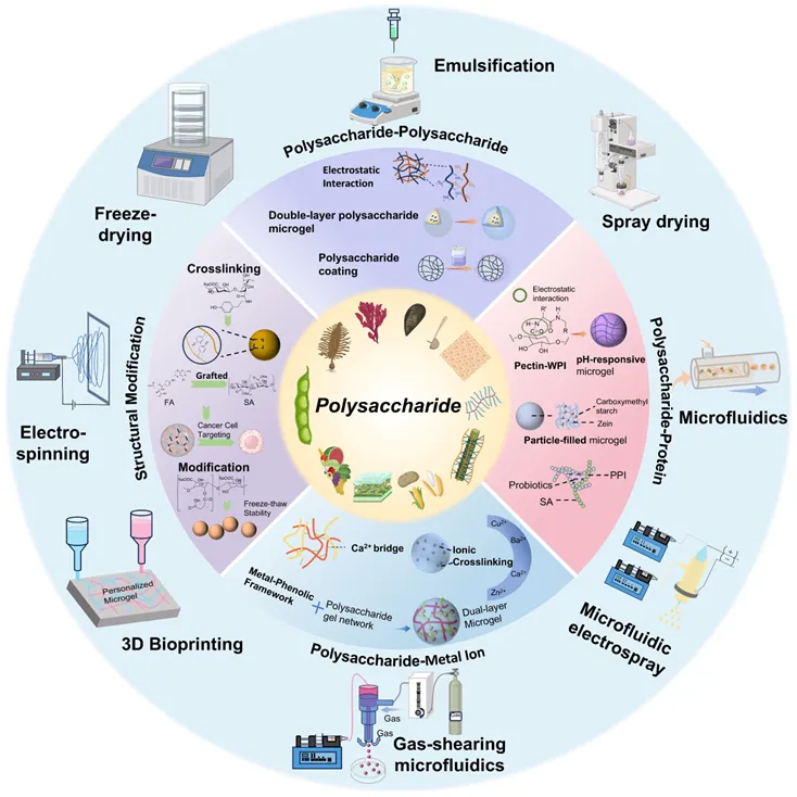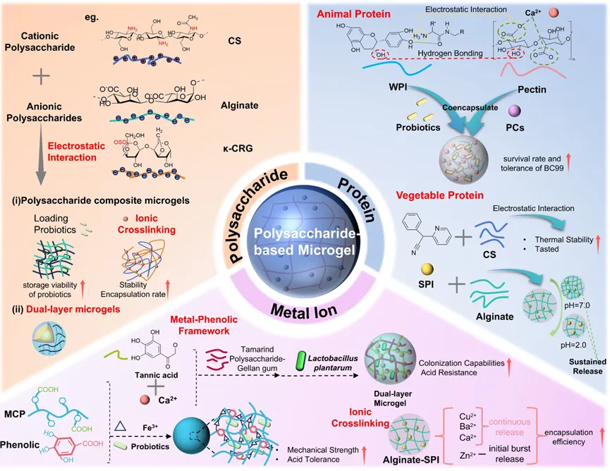 图1 多糖基复合微凝胶的构建示意图,通过多糖与其他多糖、蛋白质及金属离子的相互作用增强稳定性与控释性