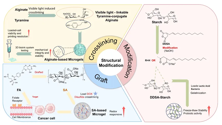 图2 多糖基微凝胶的结构改性,通过交联、接枝与化学修饰增强稳定性与功能性。