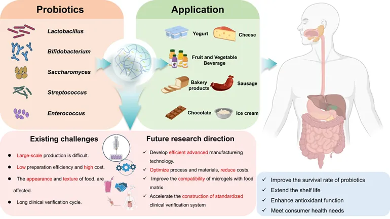 该研究系统构建了多糖微凝胶用于益生菌递送的“材料—结构—制备—应用”框架,强调通过结构调控实现益生菌“加工可存活、储存更稳定、消化可抵达、肠道可释放”的目标。相比传统载体体系,多糖微凝胶兼具天然来源、安全可降解、壁材可调控以及食品工业适配性强等优势,尤其适合功能食品与特殊医学用途食品中对活菌稳定性和靶向递送的需求。未来,多糖微凝胶技术有望推动益生菌产品从“简单添加”向“结构化精准递送”升级,在酸奶、奶酪、果蔬饮料、烘焙食品及粉末化功能食品等领域具有广阔应用前景。