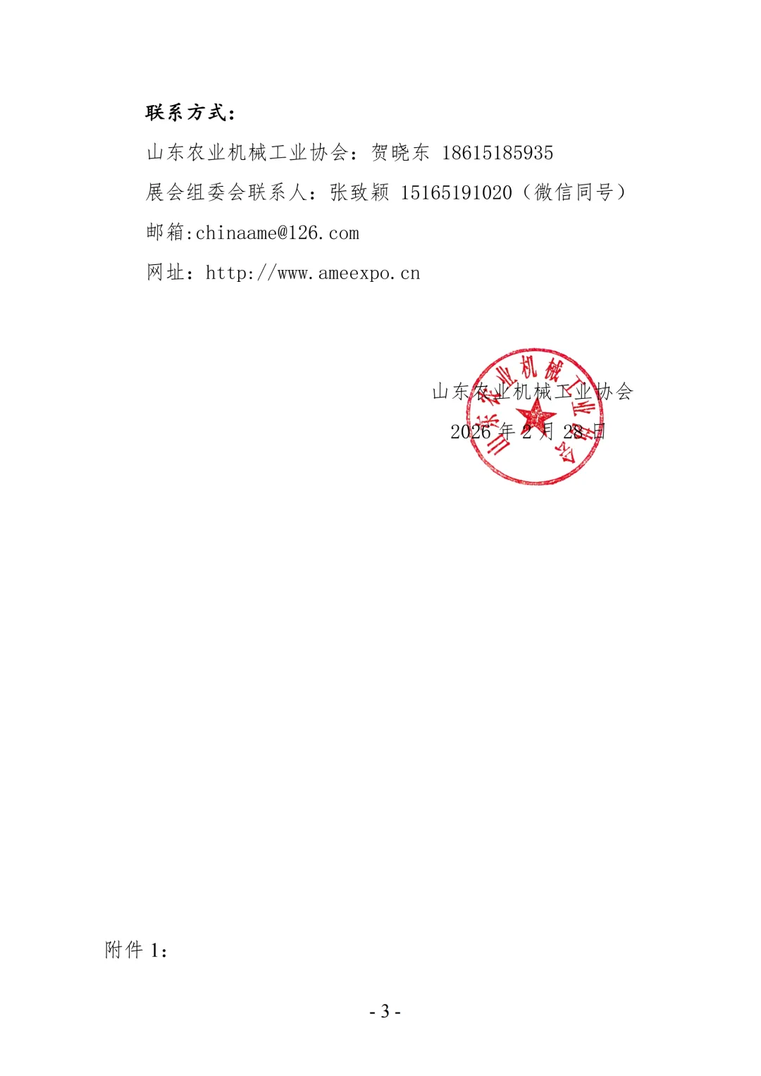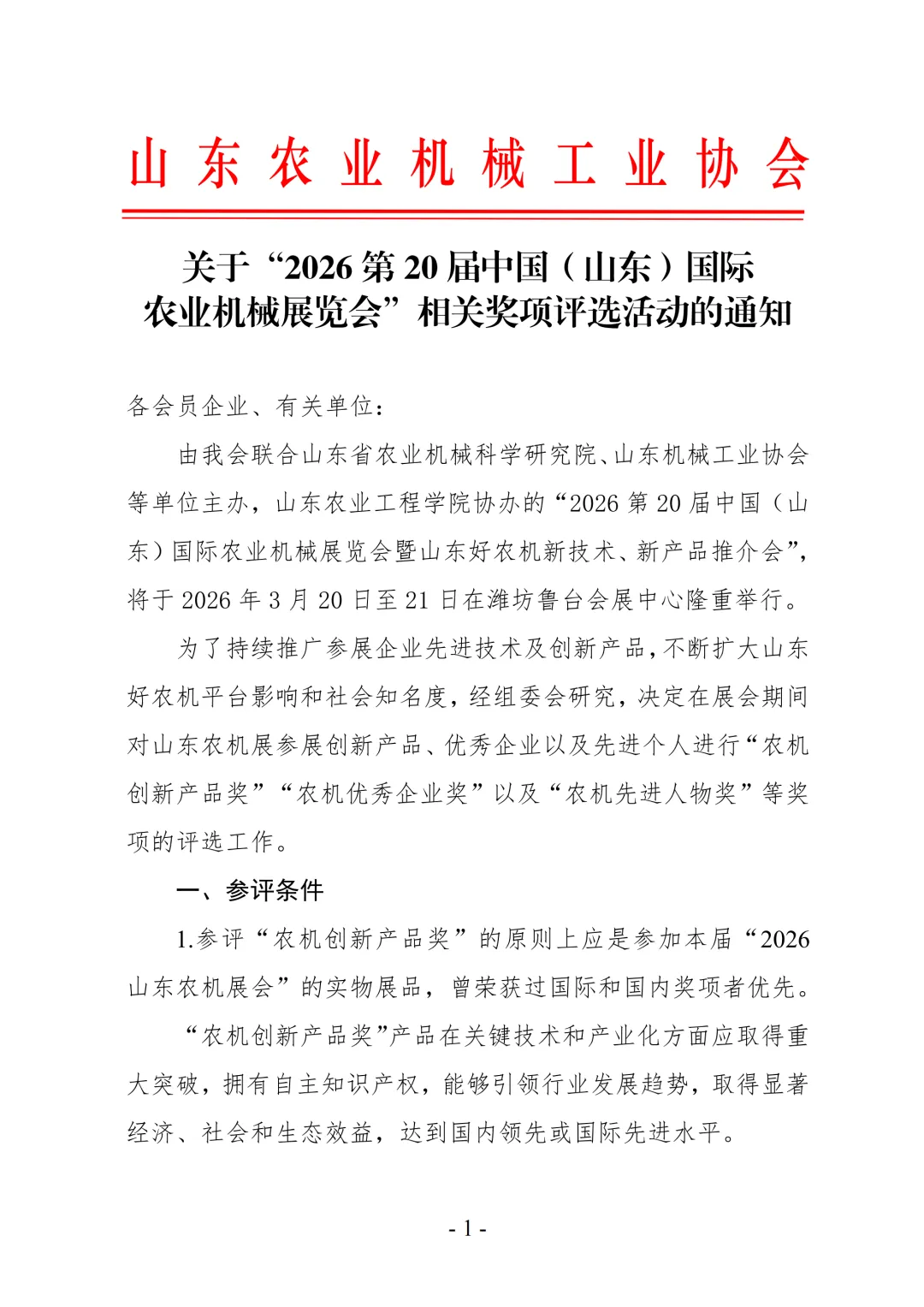 为深入贯彻落实国家乡村振兴战略部署,加快推动农机装备产业补短板、提效能,促进农机农艺深度融合,助力农业绿色高质量发展,2026第20届中国(山东)国际农业机械展览会暨山东好农机新技术、新产品推介会,定于2026年3月20日至21日在潍坊鲁台会展中心隆重举办,诚邀行业各界同仁齐聚鸢都,共赴这场赋能农机产业升级的行业盛会,共话发展新机遇、共探合作新路径。