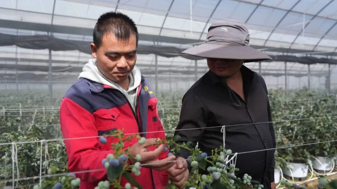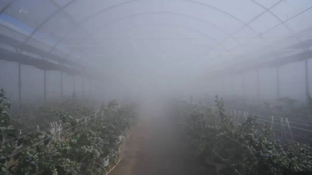 在蓝莓种植大棚,工作人员通过手机一键启动高压迷雾系统,快速降温增湿,预防烧叶,保障果品品质。