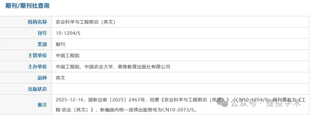 2025年12月16日,经新闻总署批复《农业科学与工程前沿(英文)》(Frontiers of Agricultural Science and Engineering)(CN10-1204/S)期刊更名为《工程·农业(英文)》(ENGINEERING Agriculture),新编国内统一连续出版物号为CN10-2073/S(捷投学术公众号独家整理)《工程·农业(英文)》(ENGINEERING Agriculture)