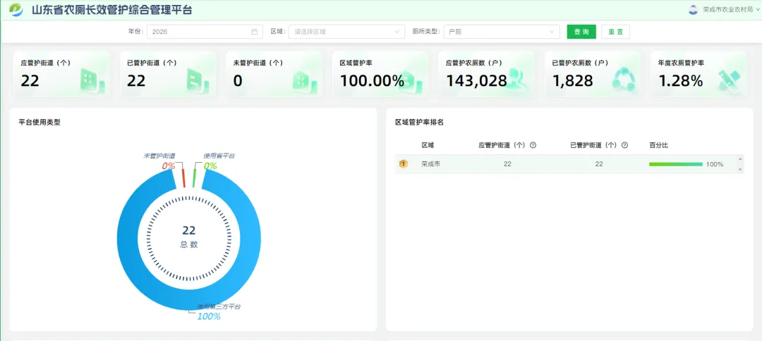 协调市水务集团与省第三方鲁担公司,完成山东省农厕长效管护综合管理平台与荣成网格化智能厕所管理系统对接工作,区域管护率达100%。(责任科室:乡村建设科)