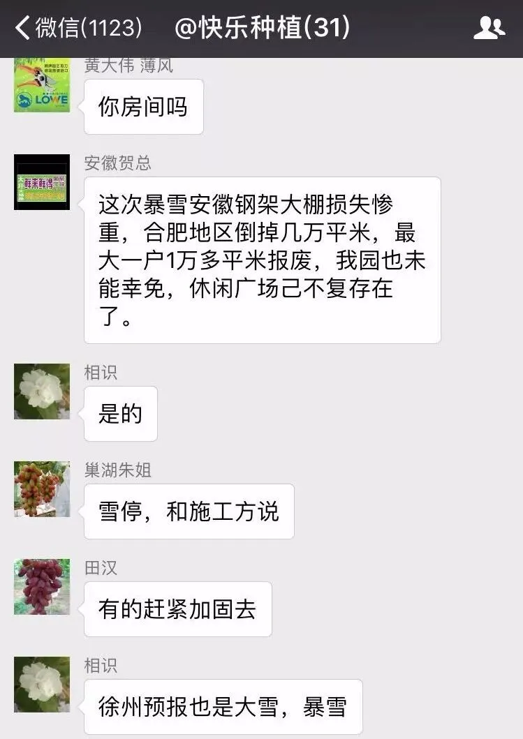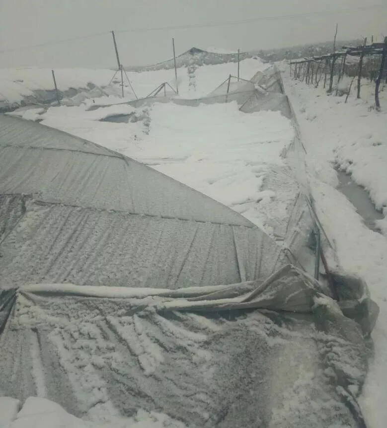 昨天晚上,我感冒加发烧,安排工人除雪,到清晨5点,工人太疲惫,坚持不了,7点过后,110亩早夏黑保温棚倒塌30亩,8点钟,又一批工人干活,立即割薄膜,雪很大,干着干着,又有30亩倒塌,下午2点,110亩,价值近200万的钢结构大棚,随着呼啸的北风,淹没在白雪中……